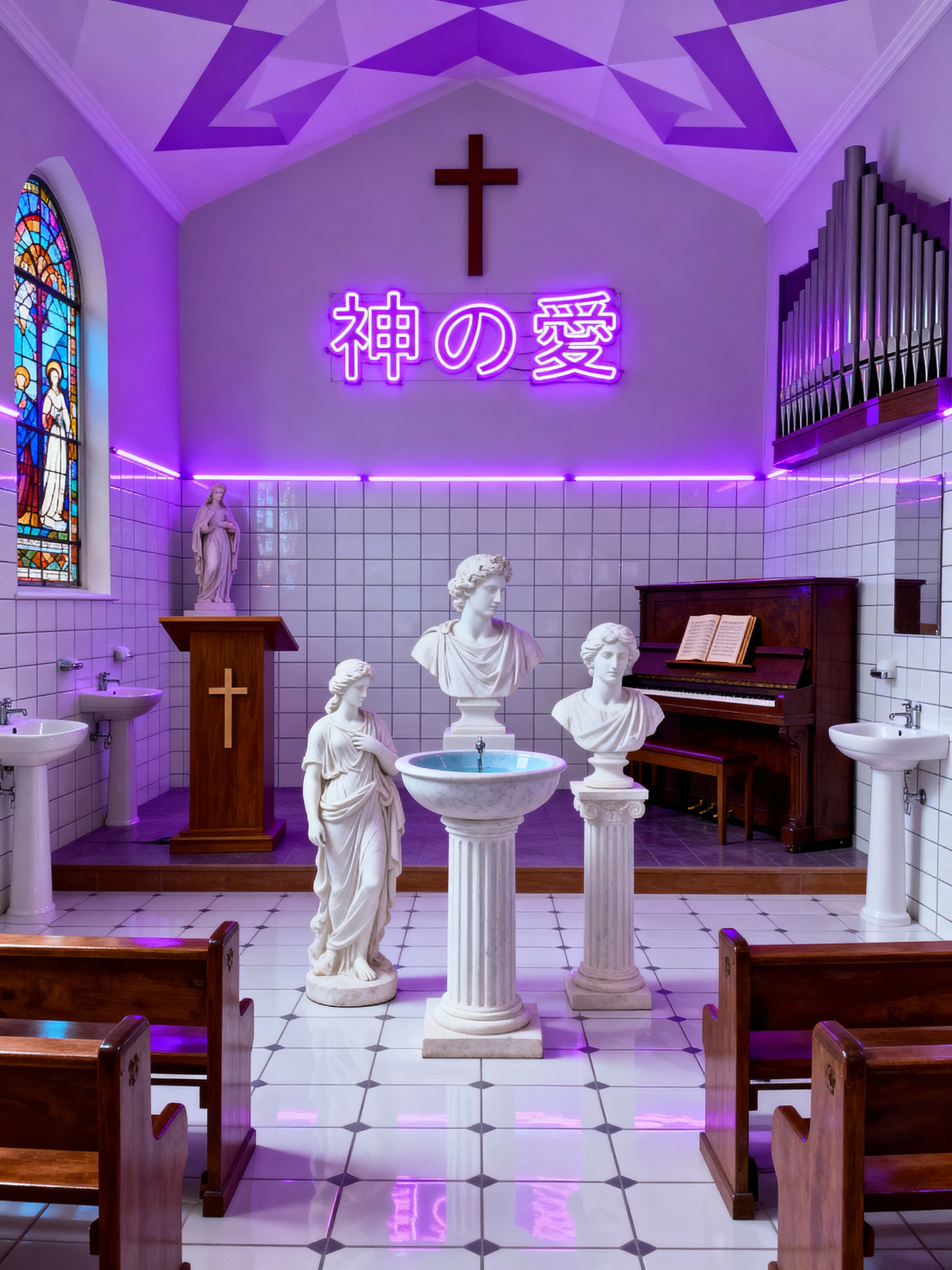 church with vaporwave style with cross and pulpit and pews and religious statues and stained glass windows and organ and hymn books and baptismal font. . with purple lights and white square bathroom tiles and purple lights and japanese letters on wall and neon glow and neon glow and white square bathroom tiles and white roman statues, white roman sculptures, white roman columns, white roman pillars in the center of the room,