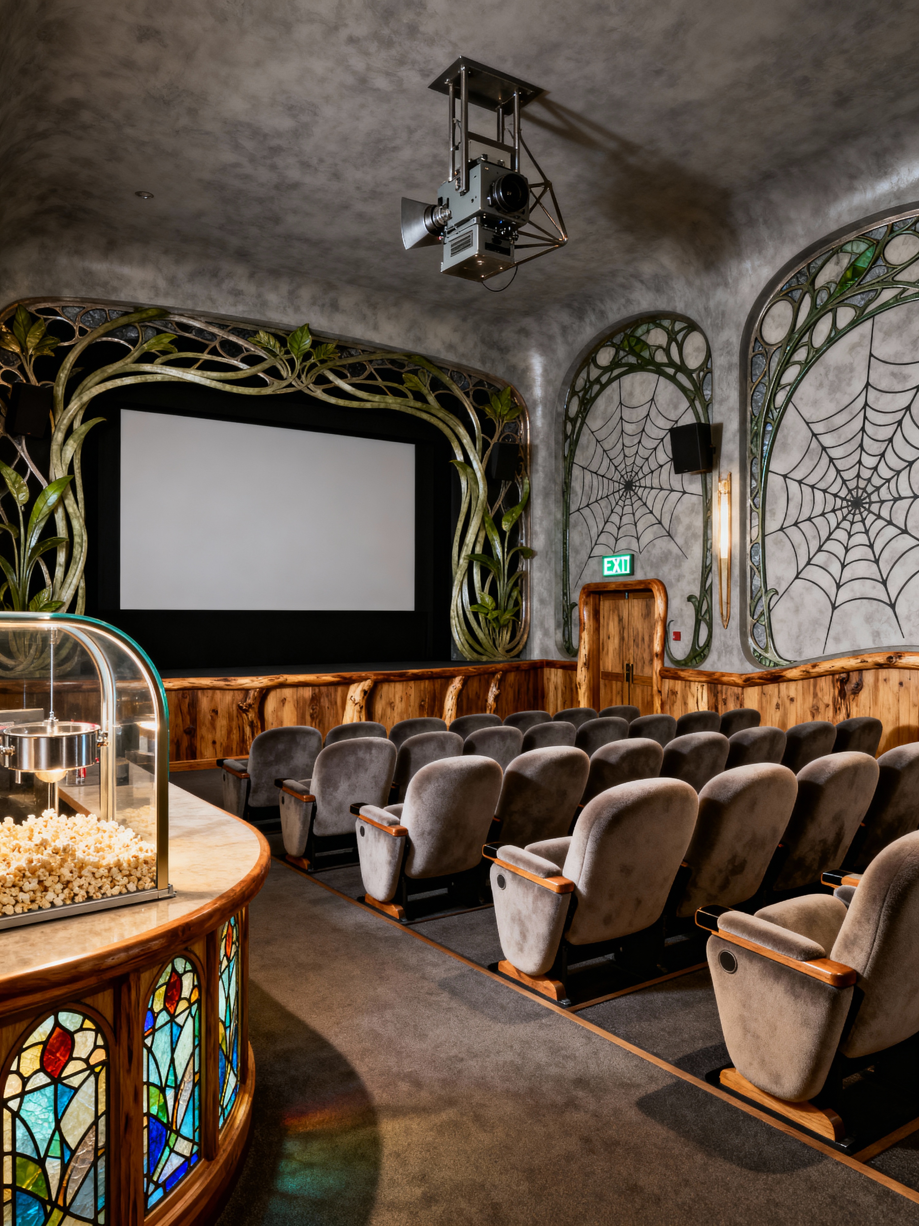 cinema with art nouveau style with popcorn machine and aisles and theater seats and concession stand and movie screen and dim lighting and projector and exit signs. . with curved glass and stained glass and natural materials and soft, rounded lines and asymmetrical shapes and ashy colors and curving, plant-like embellishments and wallpaper pattners of spider webs