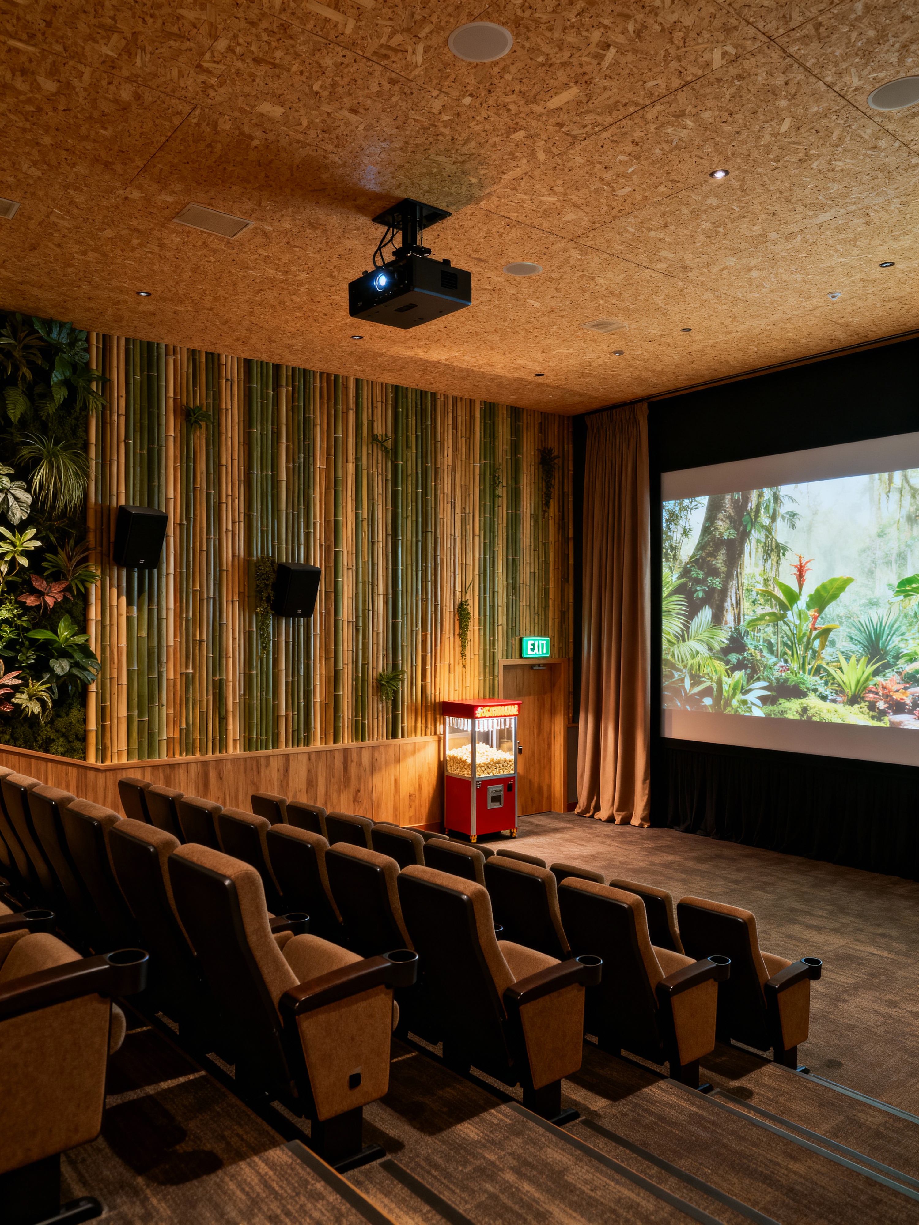 cinema with biophilic style with projector and exit signs and dim lighting and surround sound speakers and theater seats and popcorn machine and movie screen and curtains. . with calming style and wood materials and plants and bamboo materials and cork materials and natural elements and plants and images of nature