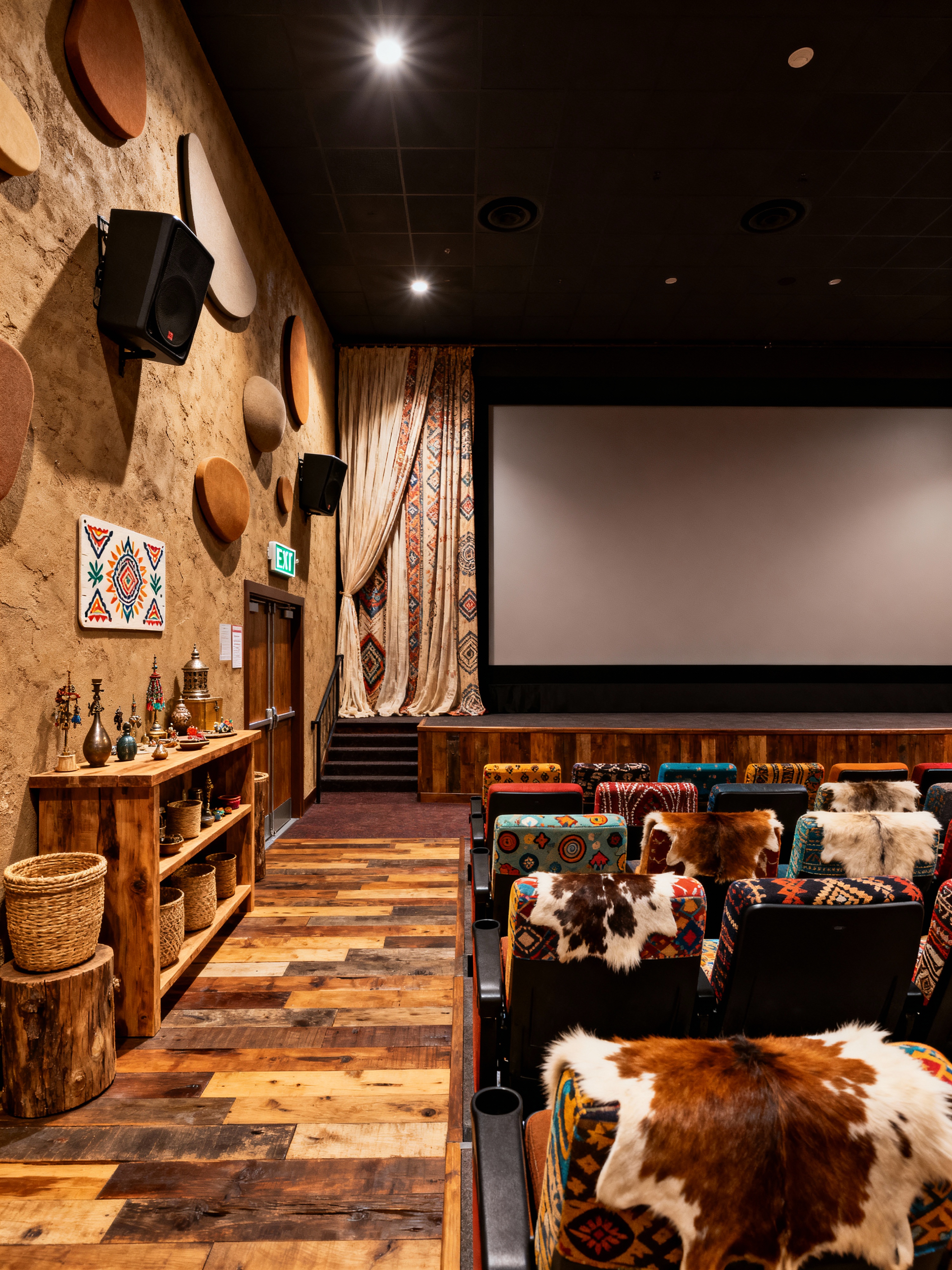 cinema with bohemian style with dim lighting and aisles and surround sound speakers and exit signs and movie screen and curtains and concession stand and theater seats. . with woods and travel trinkets and a lack of structure and carefree layers of pattern, texture, and color and playful patterns and natural materials and metals and animal hides