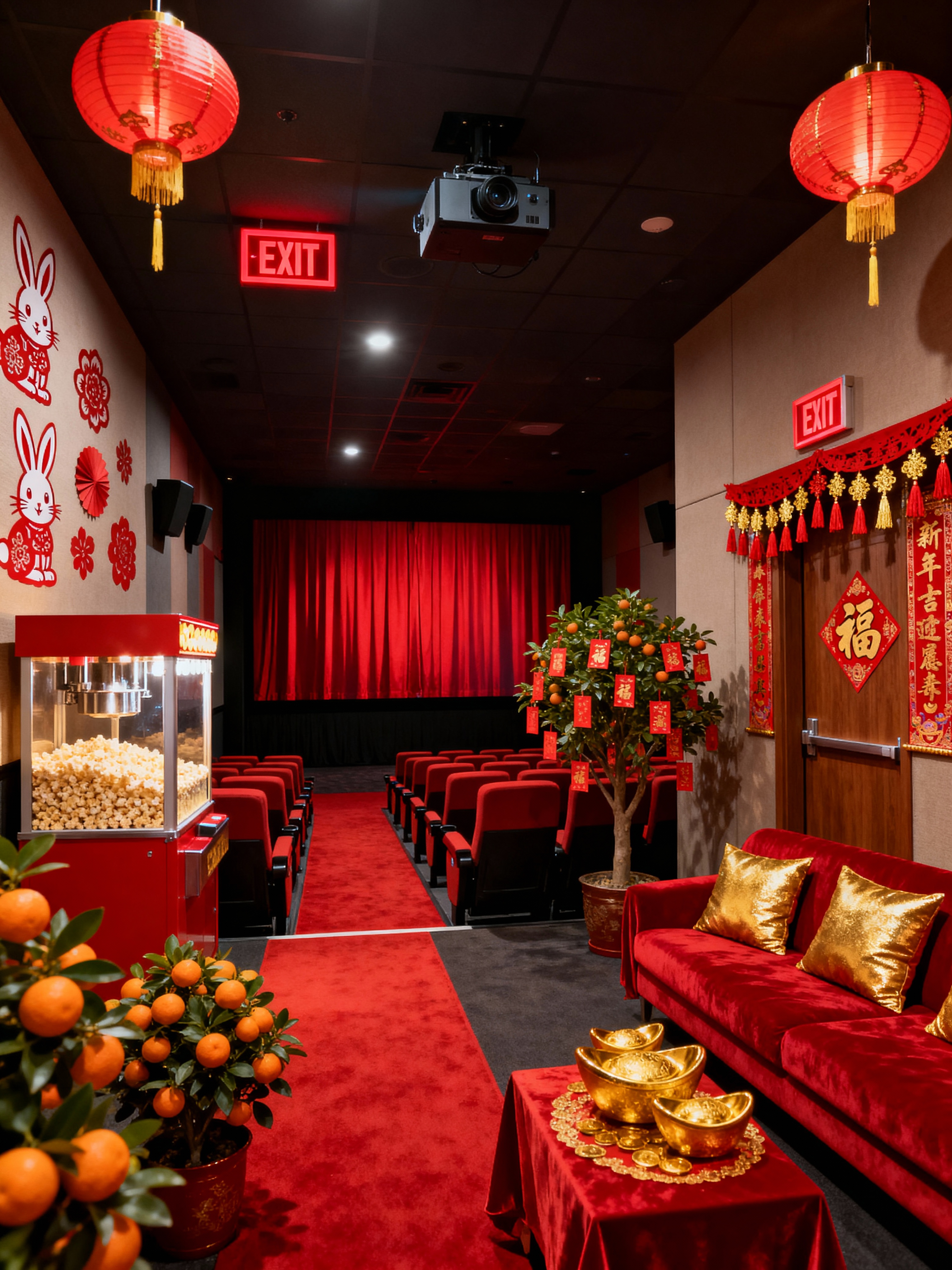 cinema with chinese new year style with concession stand and popcorn machine and aisles and movie screen and curtains and dim lighting and projector and exit signs. . with chinese red lanterns and paper cuttings and orange trees and red fabric & pillows and money tree and red and gold tassels and gold ingots and door couplets