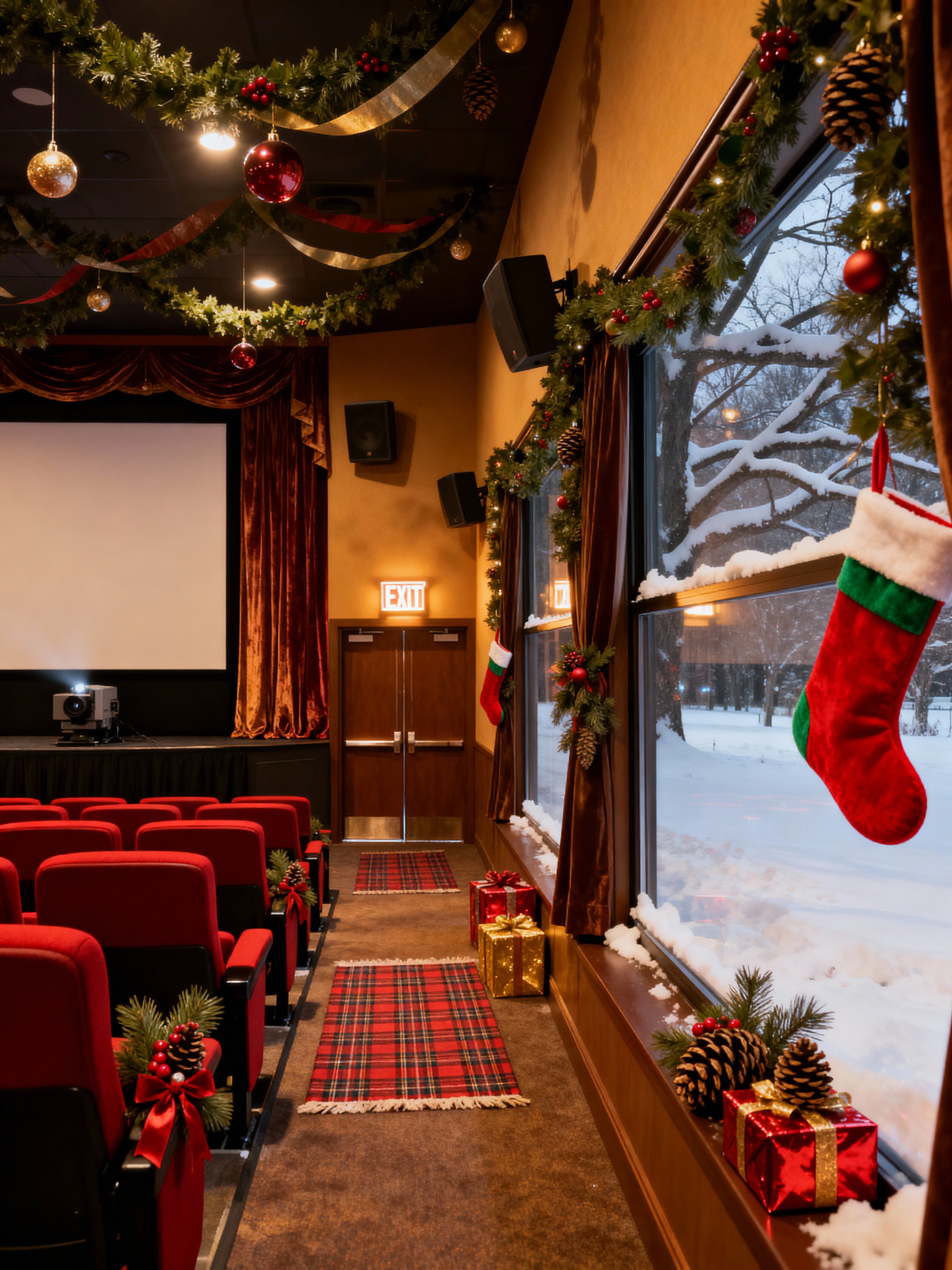 cinema with christmas style with dim lighting and aisles and projector and movie screen and curtains and exit signs and surround sound speakers and theater seats. . with snow outside and ribbons and berries and greenery draped and christmas ornaments and a few big socks hanging and tie pinecones and berries and giftwrapped gifts and plaid rugs