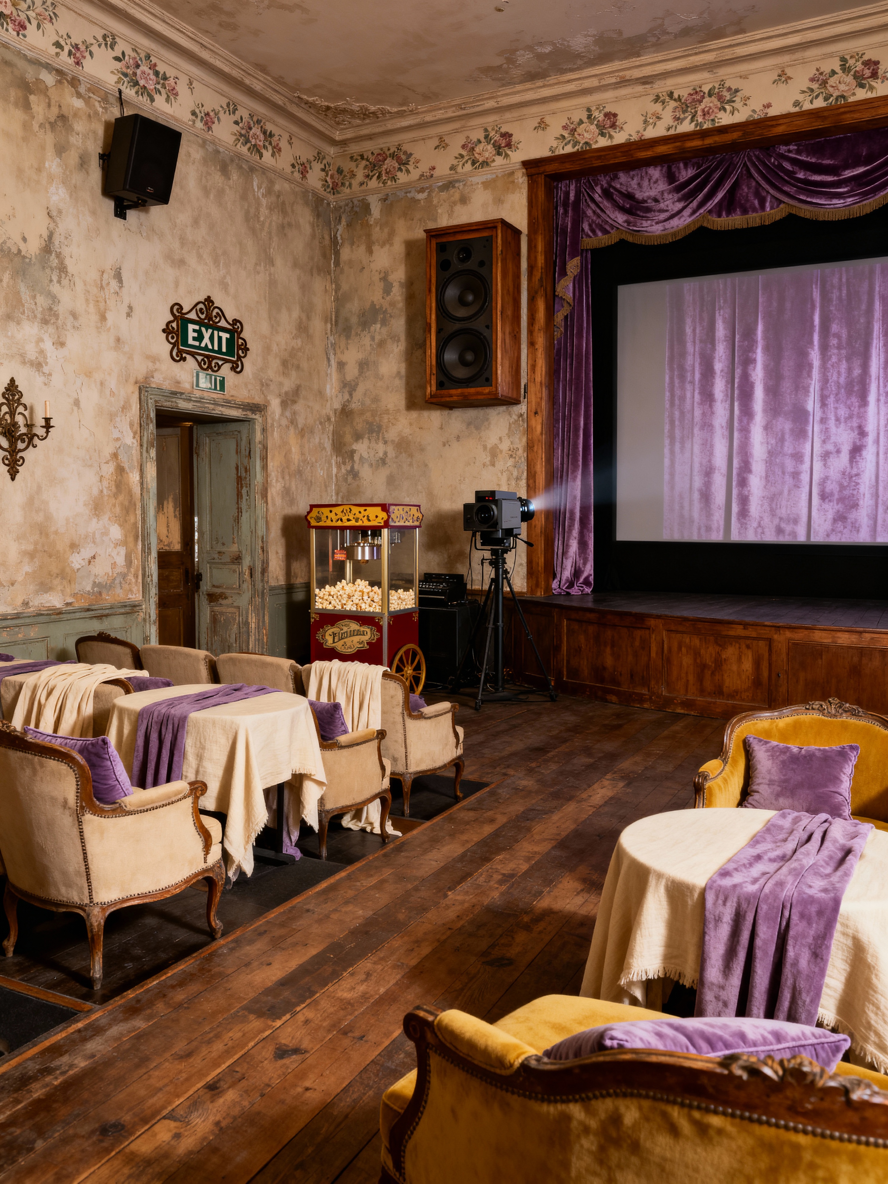 cinema with french country style with projector and aisles and popcorn machine and surround sound speakers and movie screen and exit signs and dim lighting and curtains. . with distressed wood and textured walls and antique decor and soft fabrics and lavender accents and warm tones and vintage furniture and ornate details
