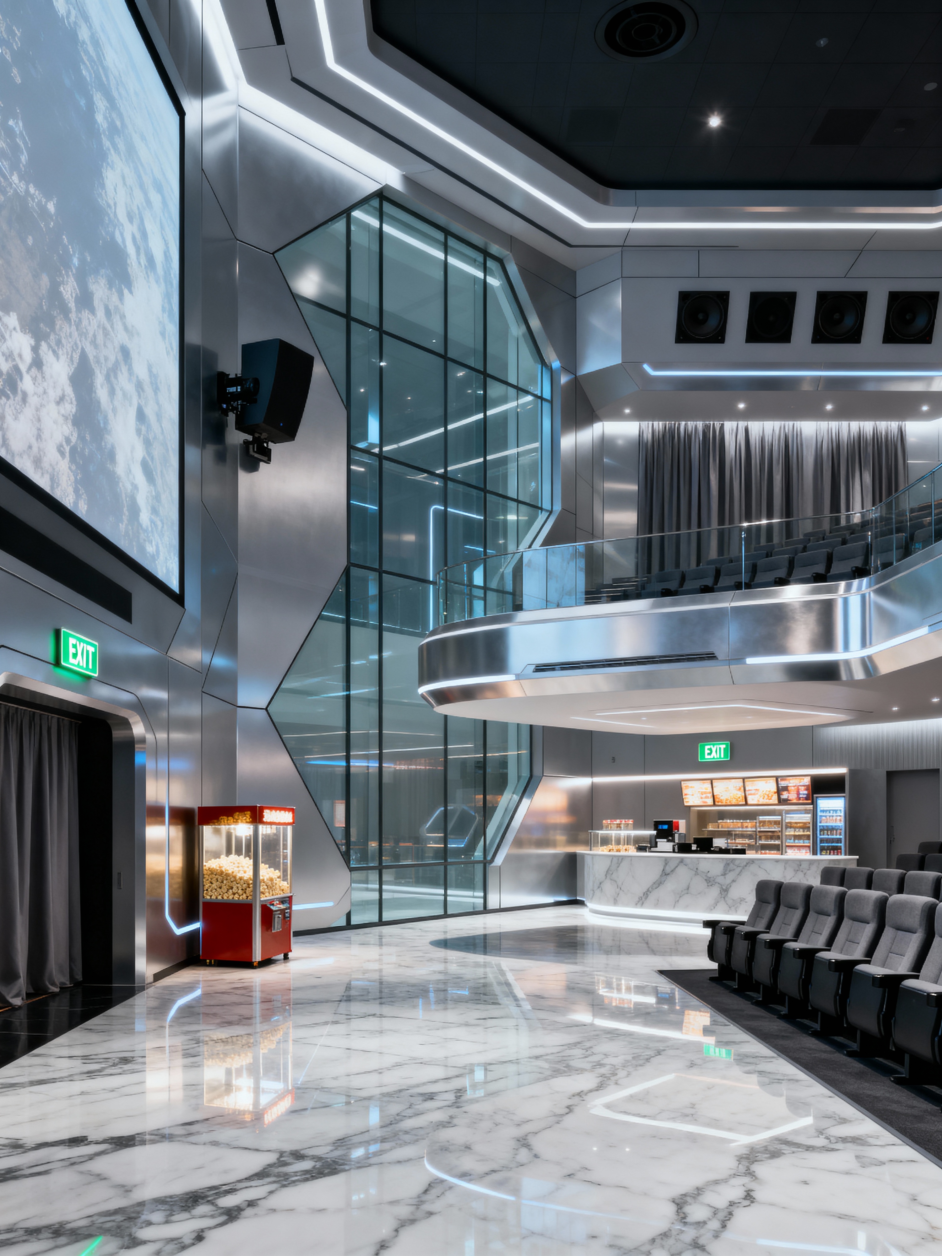 cinema with futuristic style with surround sound speakers and curtains and popcorn machine and projector and aisles and theater seats and exit signs and concession stand. . with minimalist clean lines and steel finishing and glass panes and smooth marble and futuristic interior and strong geometric walls and spaceship interior and floating surfaces