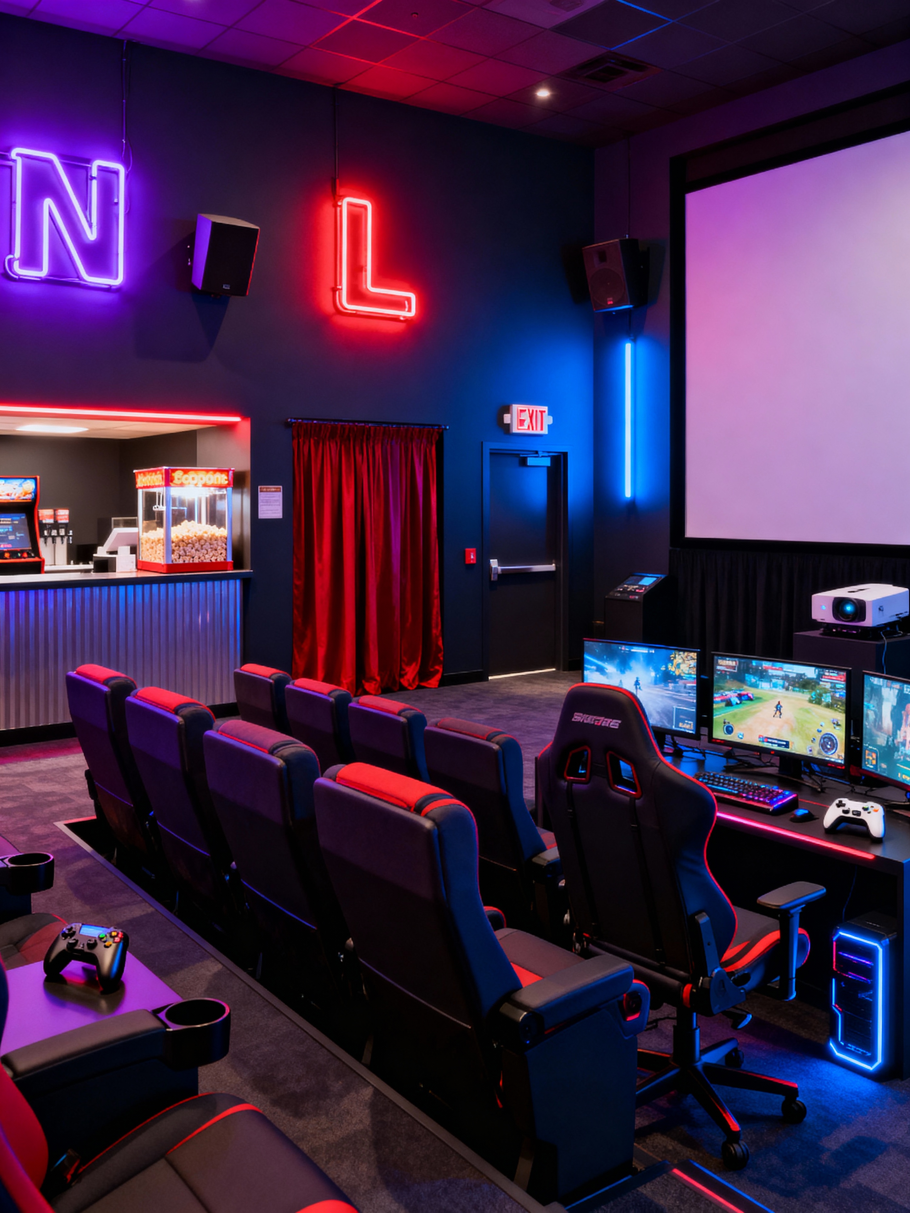 cinema with gaming room style with concession stand and curtains and theater seats and movie screen and exit signs and popcorn machine and projector and surround sound speakers. . with multiple displays and dark walls and purple, red and blue fade light and neon letters on wall and speakers and gaming chair and neon lights and video game consoles