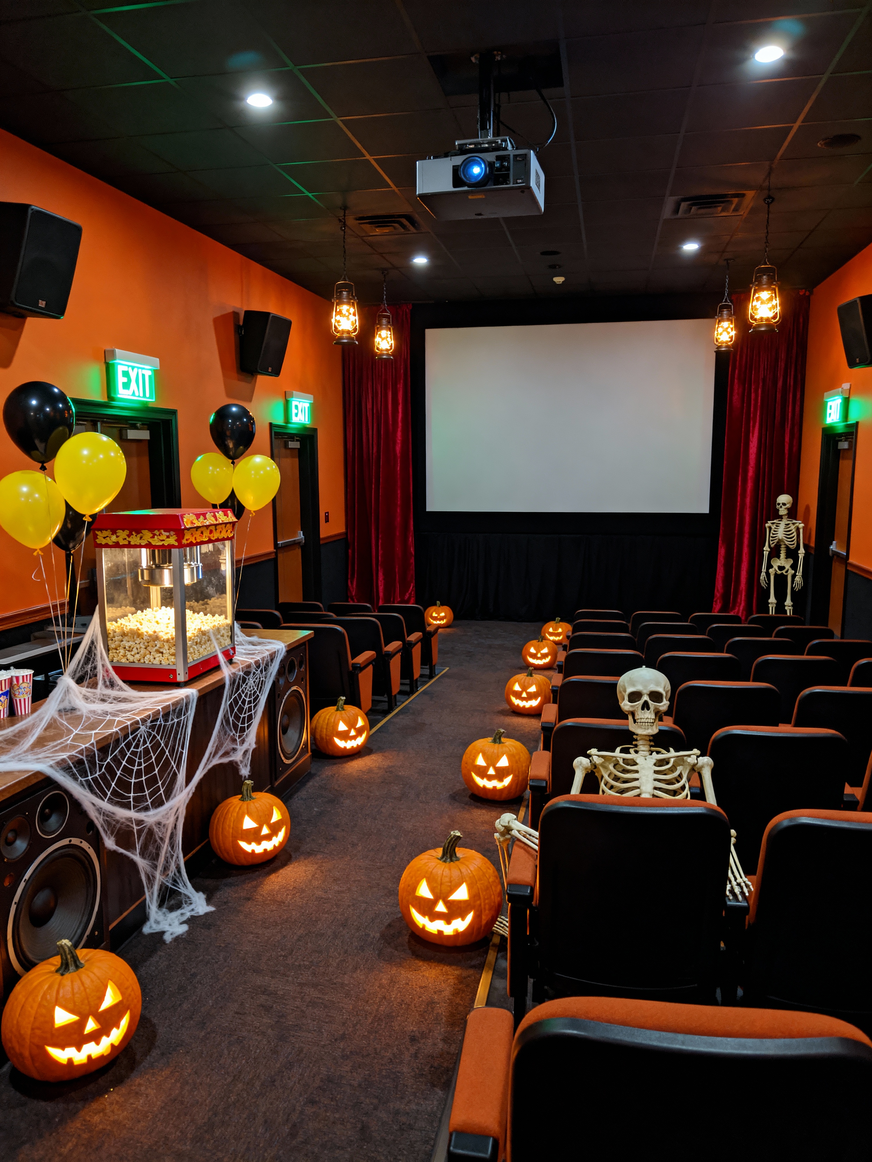 cinema with halloween style with projector and curtains and dim lighting and exit signs and surround sound speakers and concession stand and popcorn machine and movie screen. . with glowing pumpkins and spiderwebs and cobwebs and cobwebs and lanterns and yellow black balloons and lanterns and skeletons sitting and standing