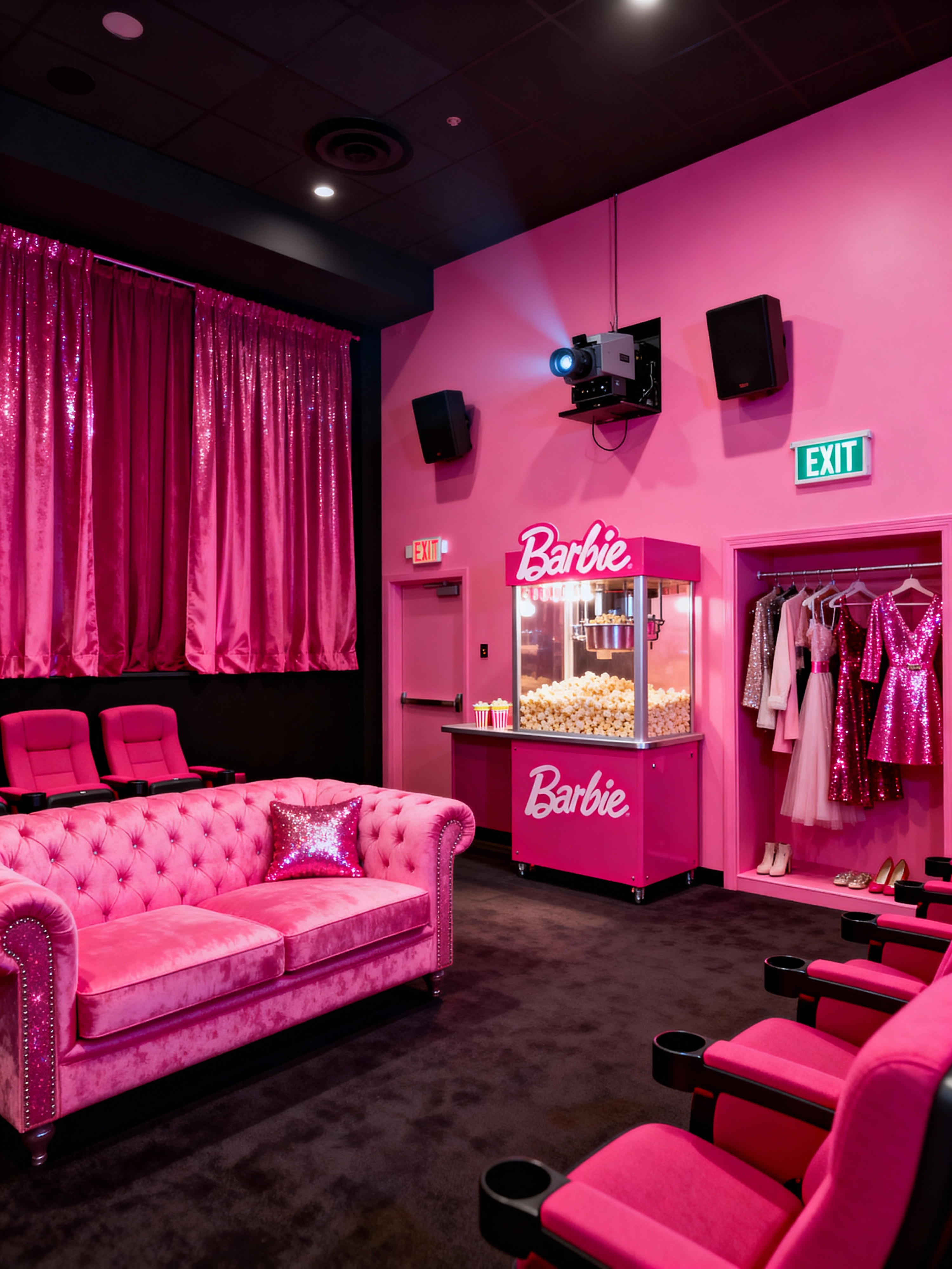 cinema with hot pink style with projector and concession stand and dim lighting and popcorn machine and theater seats and curtains and exit signs and surround sound speakers. . with barbie sofa and hot pink barbie colors and barbie style interior and barbie closet and barbie bold rosy hues like fuchsia and magenta and hot pink barbie walls and barbie chairs and barbie glitter and sparkle
