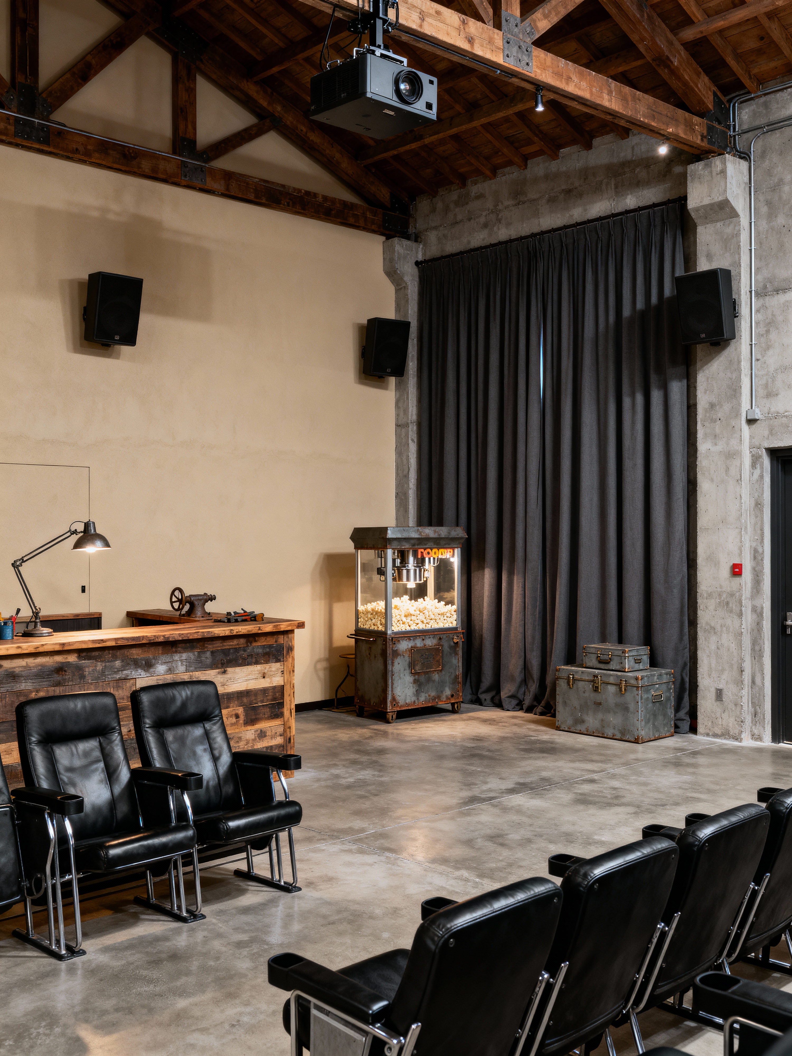 cinema with industrial style with projector and aisles and surround sound speakers and concession stand and popcorn machine and dim lighting and curtains and theater seats. . with neutral tones and reclaimed wood and open floorplan and raw aesthetic and exposed concrete and factory style and utilitarian objects and exposed rafters
