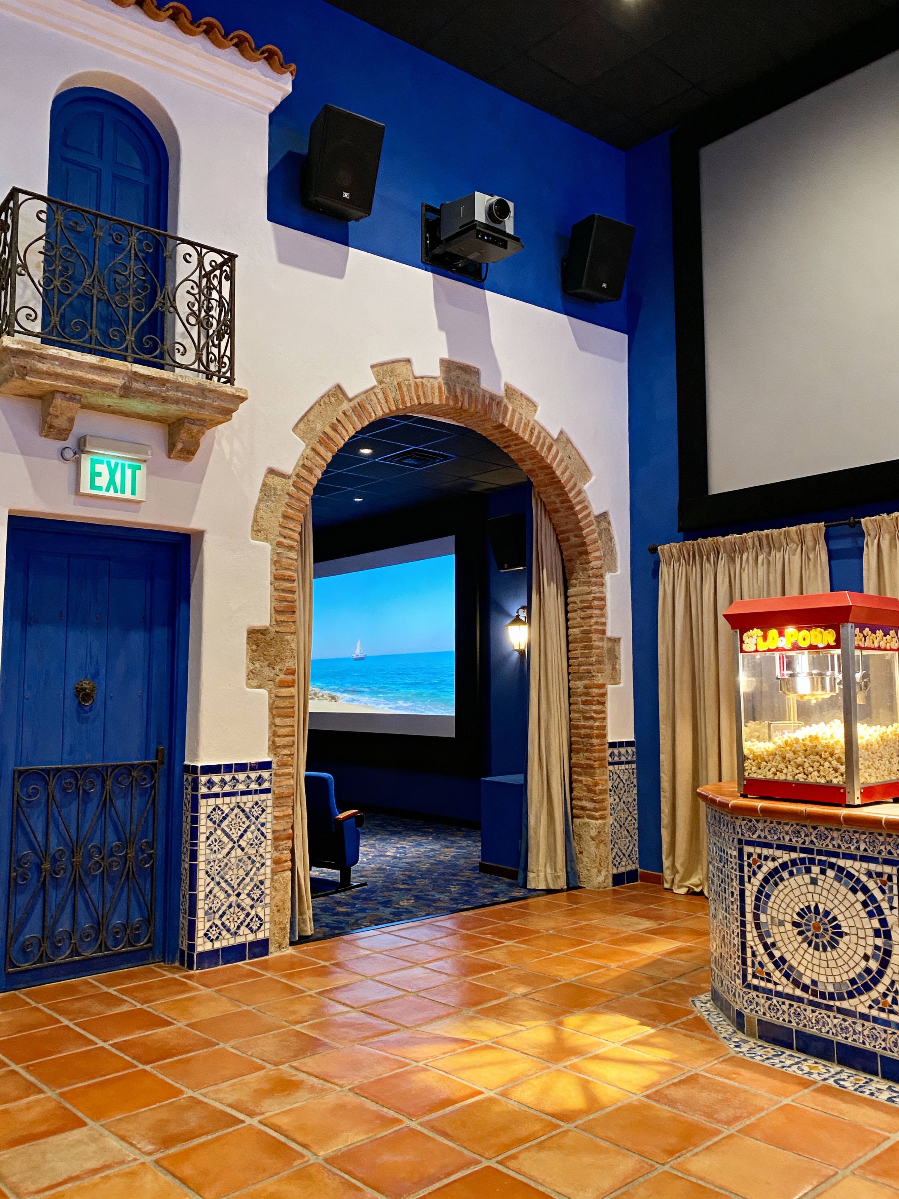 cinema with mediterranean style with exit signs and projector and movie screen and dim lighting and concession stand and popcorn machine and curtains and surround sound speakers. . with wrought iron and rustic charm and blue and white and terracotta tiles and arched doorways and coastal influence and mosaic patterns and sun-drenched