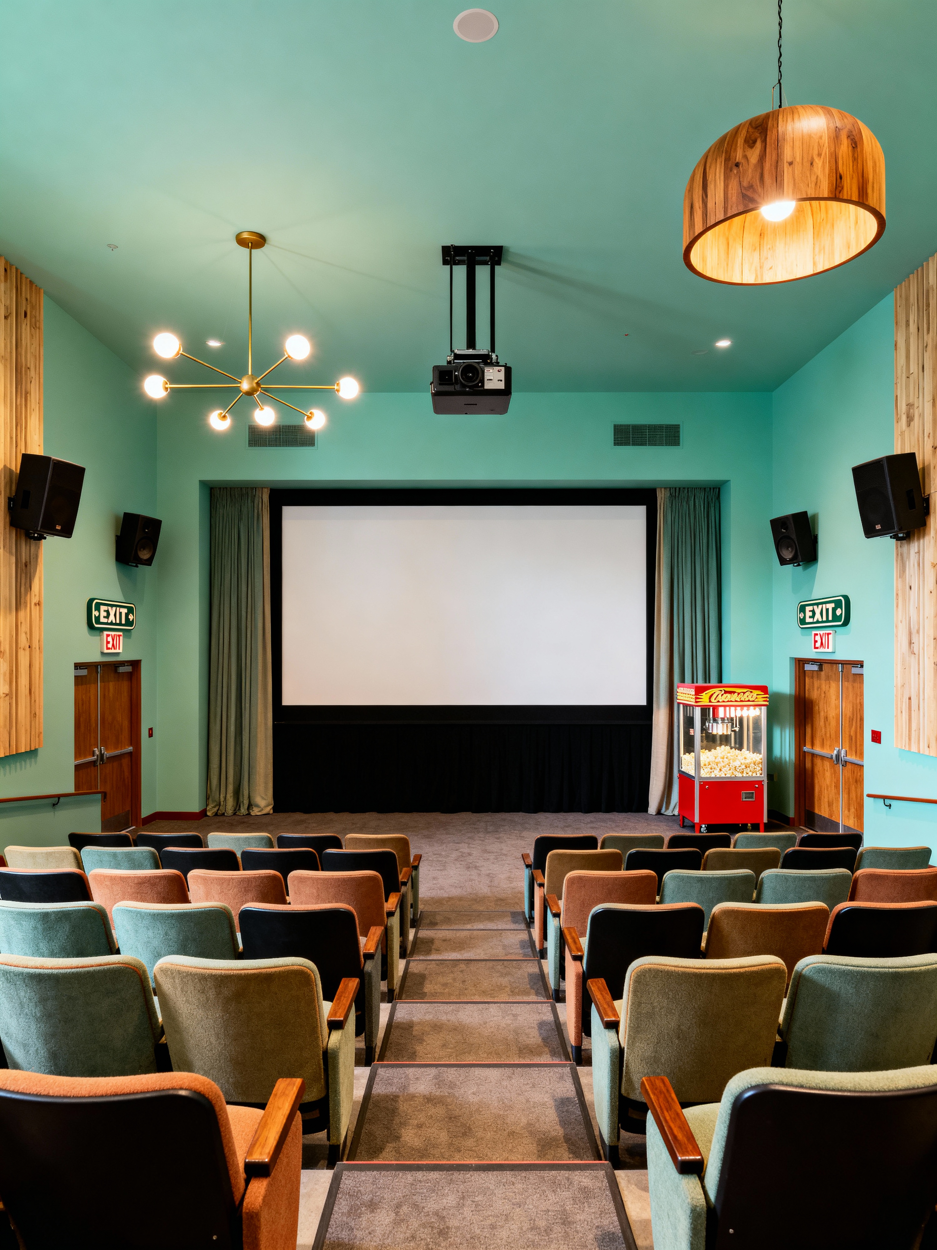 cinema with midcentury modern style with movie screen and projector and theater seats and popcorn machine and surround sound speakers and aisles and curtains and exit signs. . with vibrant colors and integrating indoor and outdoor motifs and clean lines and muted tones and function over form and minimalist and mid century modern mobile chandelier and wood pendant light mid century modern chandelier