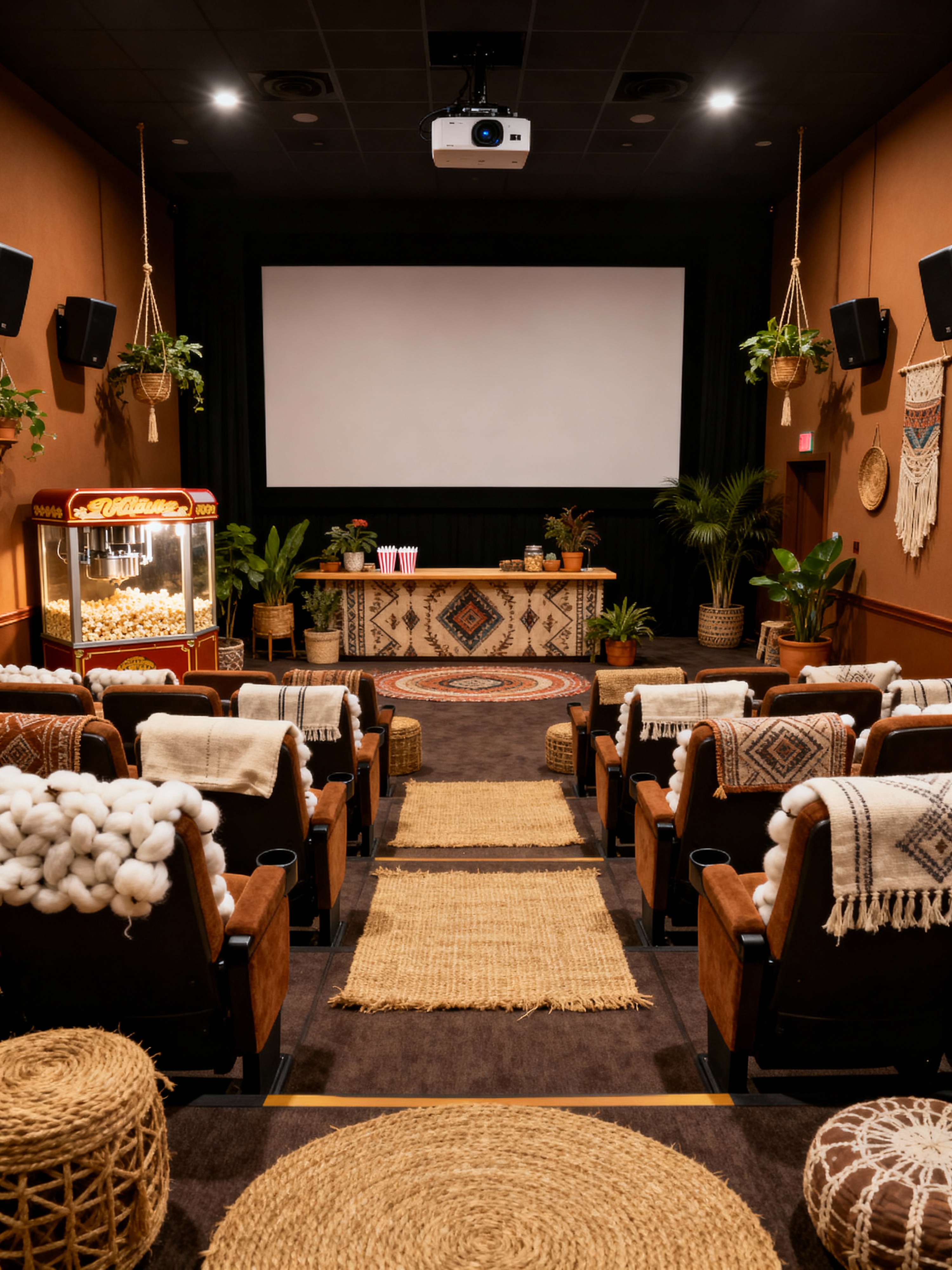 cinema with modern boho style with theater seats and popcorn machine and dim lighting and aisles and surround sound speakers and projector and concession stand and movie screen. . with earthy tones and cotton textiles and hanging plants and jute rugs and potted plants and plants and cozy feel and expressive decor