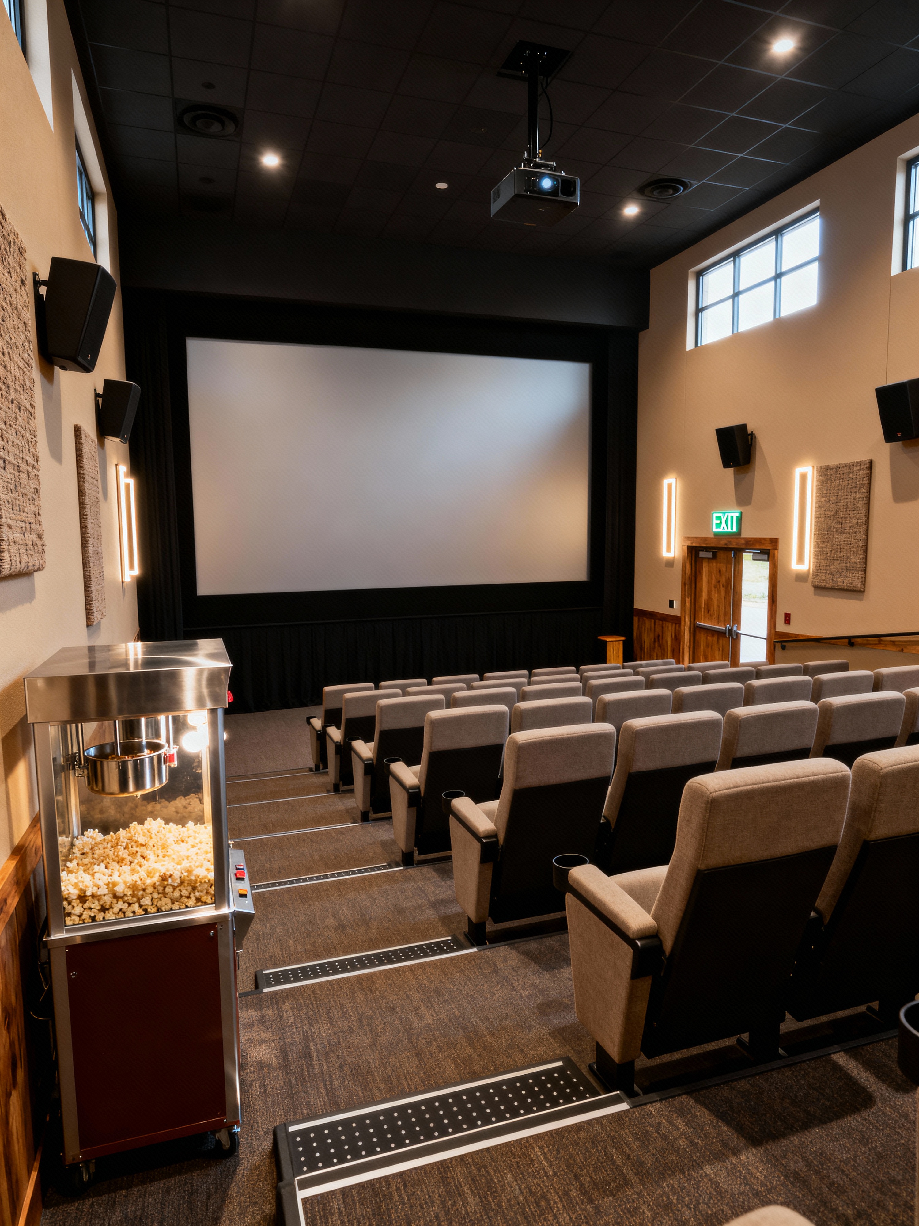 cinema with modern style with dim lighting and aisles and theater seats and exit signs and popcorn machine and surround sound speakers and movie screen and projector. . with practicality and functionality and simple, clean lines and simplistic furniture and neutral walls and textures and natural materials and elements and open and natural lighting and practicality and functionality