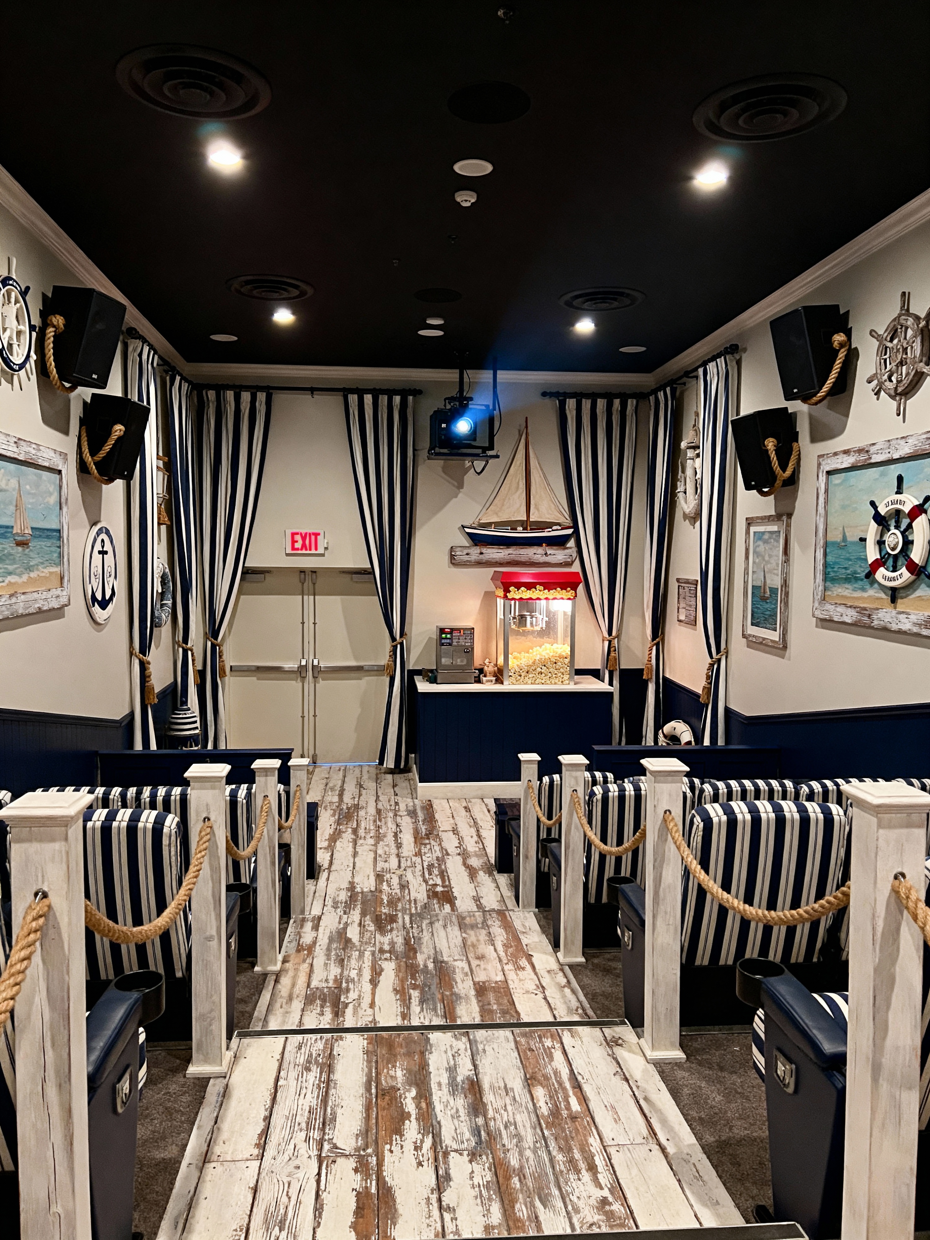 cinema with nautical style with curtains and aisles and exit signs and surround sound speakers and popcorn machine and dim lighting and concession stand and projector. . with maritime decor and coastal vibes and striped patterns and weathered wood and navy blue and sailboat elements and ocean inspiration and rope details