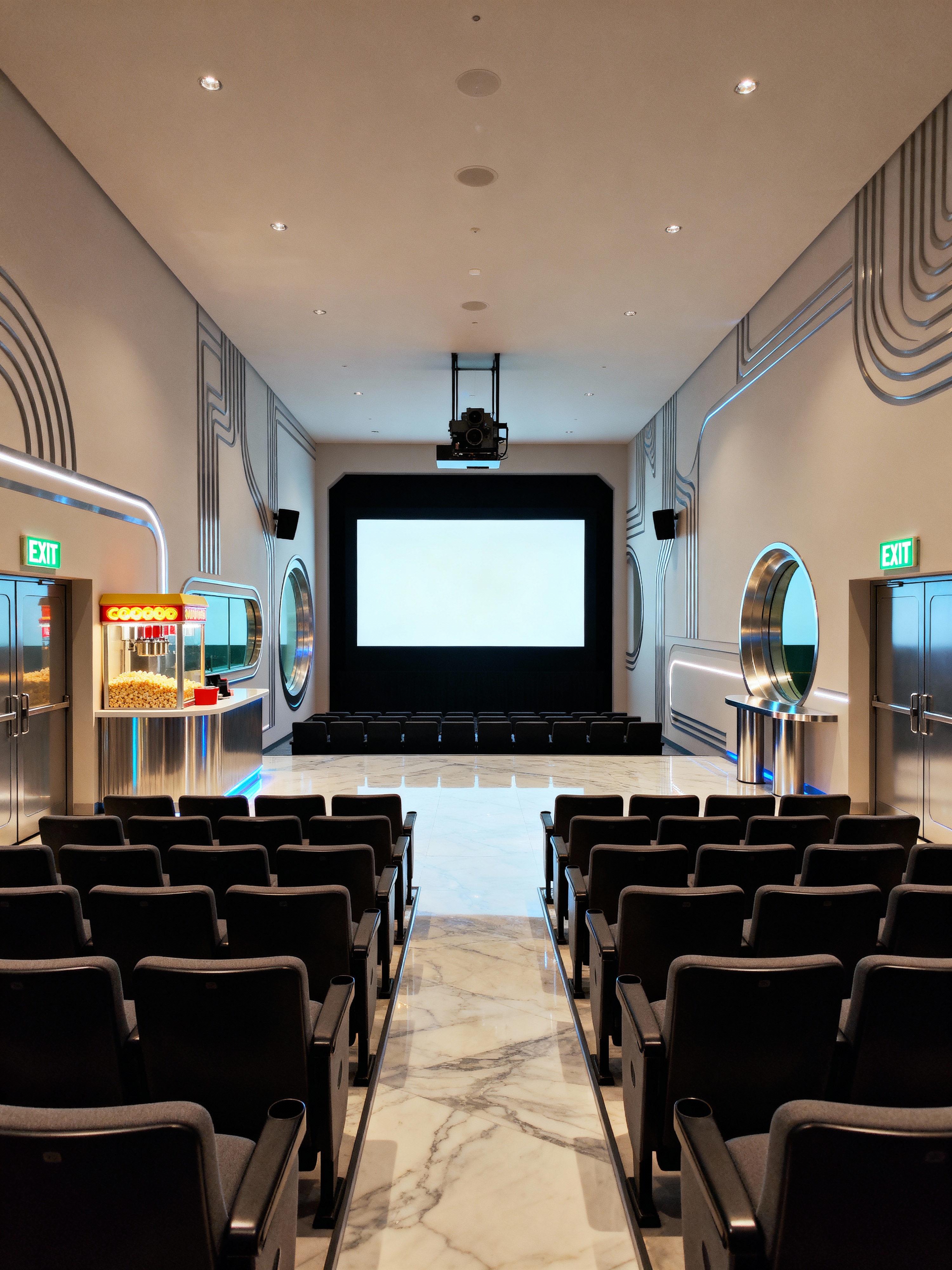cinema with retro futuristic style with movie screen and concession stand and exit signs and theater seats and projector and dim lighting and aisles and popcorn machine. . with smooth polished marble and futurism minimalist interior and strong geometric walls and light colors and neutral background and bright accents and steel finishing and circular shapes and glass panes