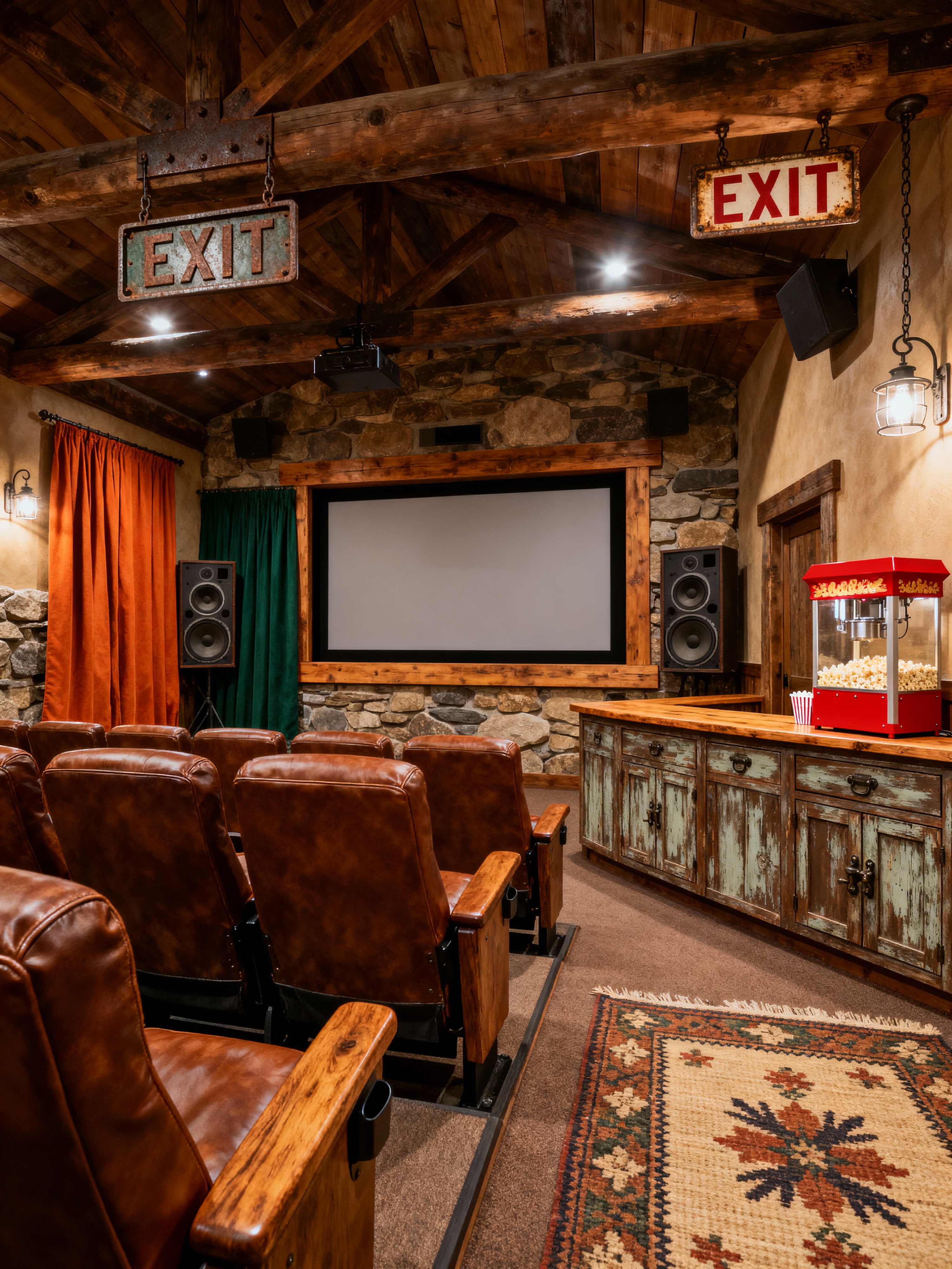 cinema with rustic style with theater seats and exit signs and curtains and dim lighting and concession stand and popcorn machine and movie screen and surround sound speakers. . with exposed beams and warmth and stone accents and earthy tones and country style and cozy cabin and woven textures and iron fixtures