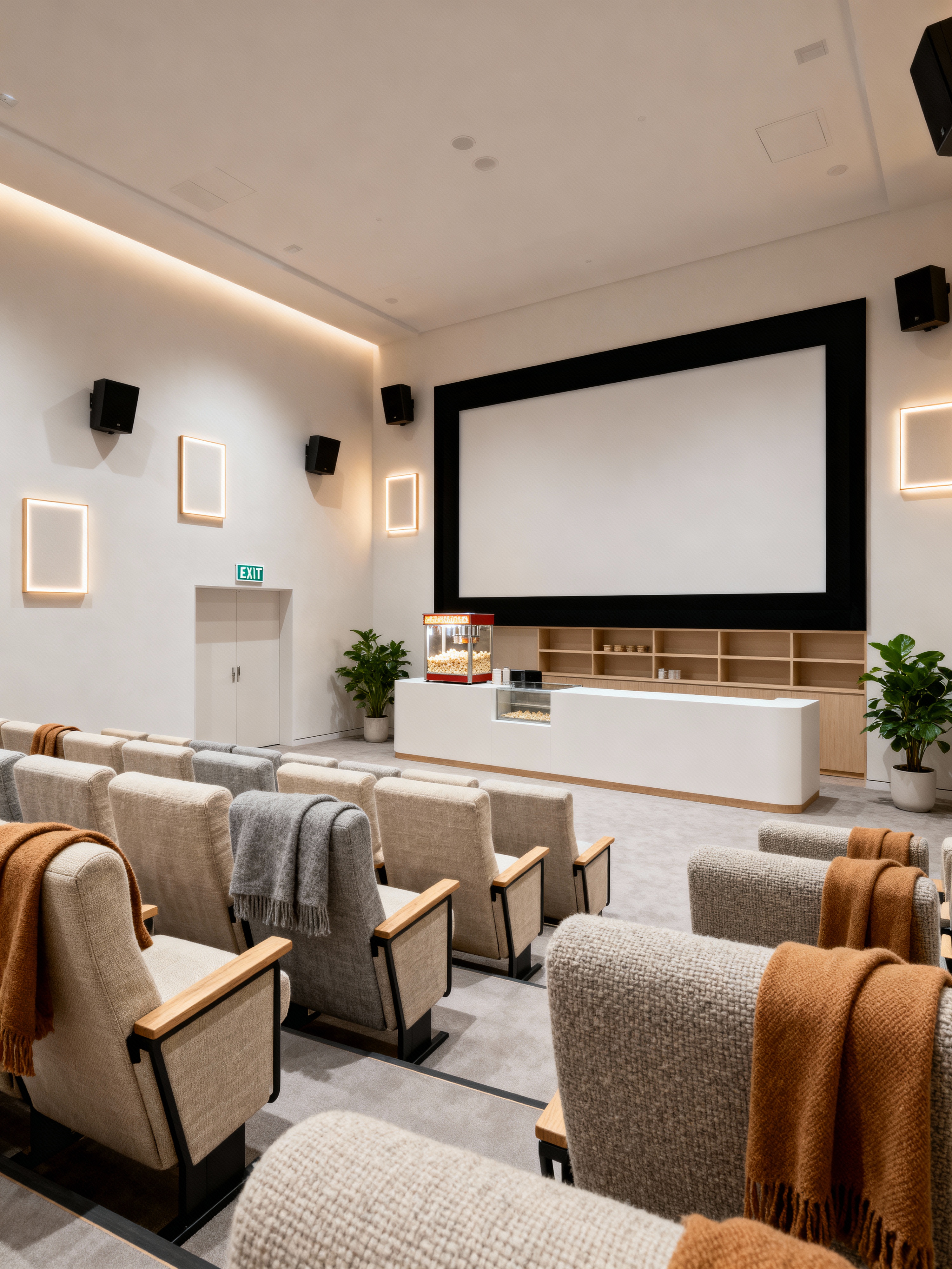 cinema with scandinavian style with movie screen and dim lighting and concession stand and surround sound speakers and exit signs and popcorn machine and theater seats and aisles. . with cozy atmosphere and textured fabrics and functional furniture and hygge and minimalist design and clean lines and simple elegance and neutral palette