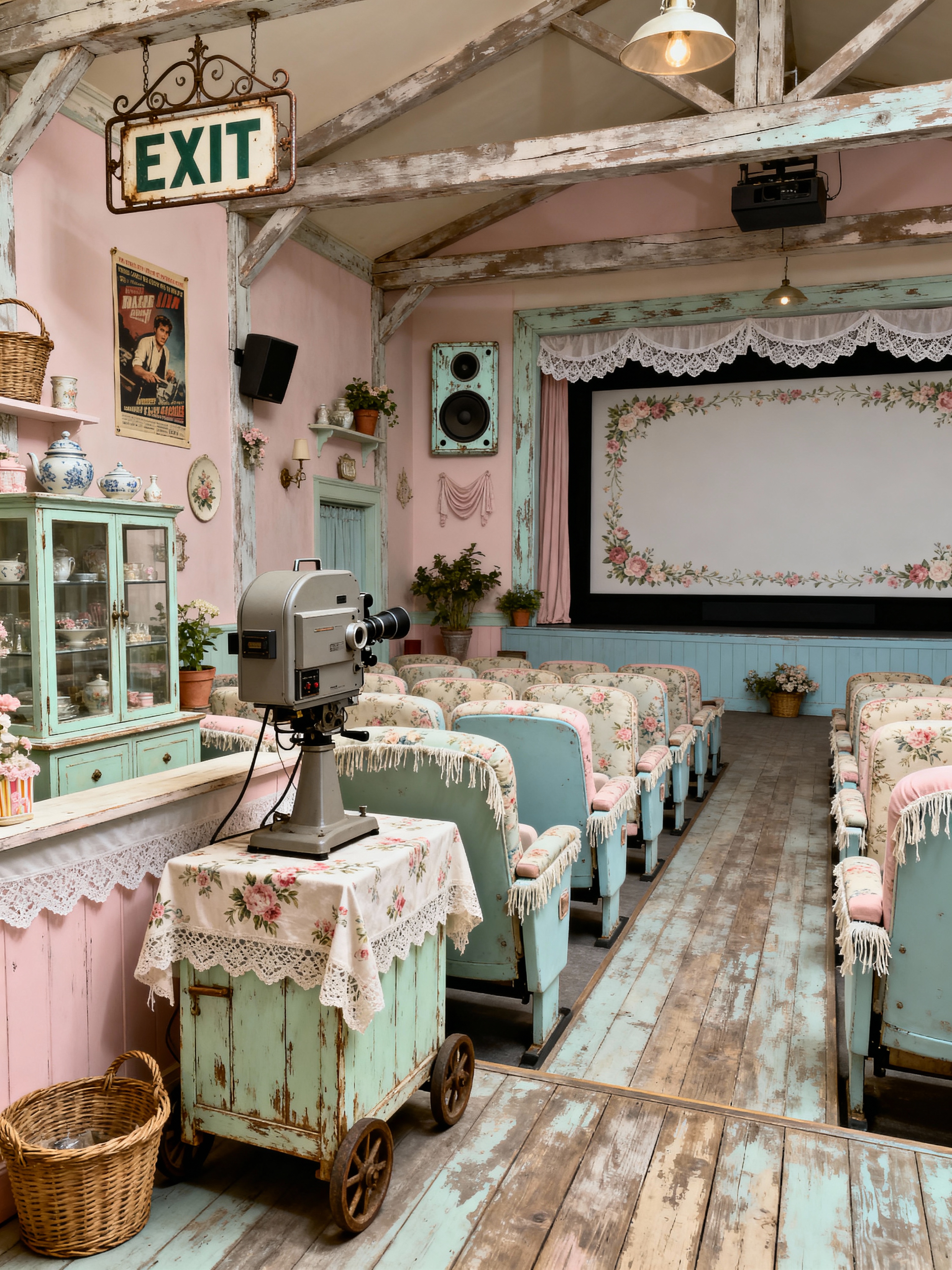 cinema with shabby chic style with concession stand and projector and theater seats and aisles and exit signs and dim lighting and surround sound speakers and movie screen. . with feminine touches and floral patterns and soft textures and cottage feel and weathered finishes and pastel colors and delicate details and vintage charm