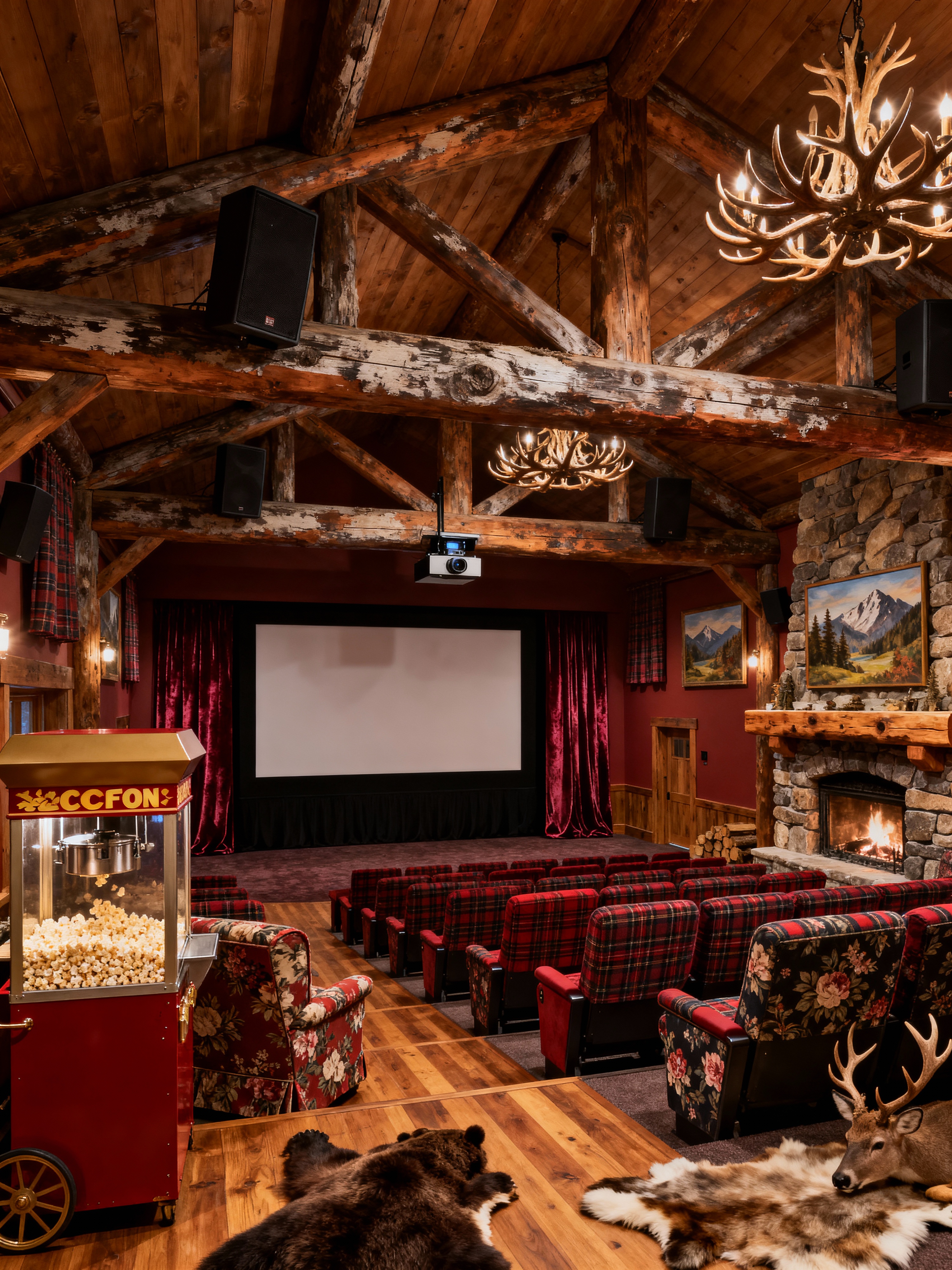cinema with ski chalet style with concession stand and popcorn machine and movie screen and dim lighting and aisles and curtains and surround sound speakers and projector. . with exposed construction beams and richly patterned fabrics and stone fireplace and rustic and nature-inspired and exposed wood and mountain-inspired and animal furs