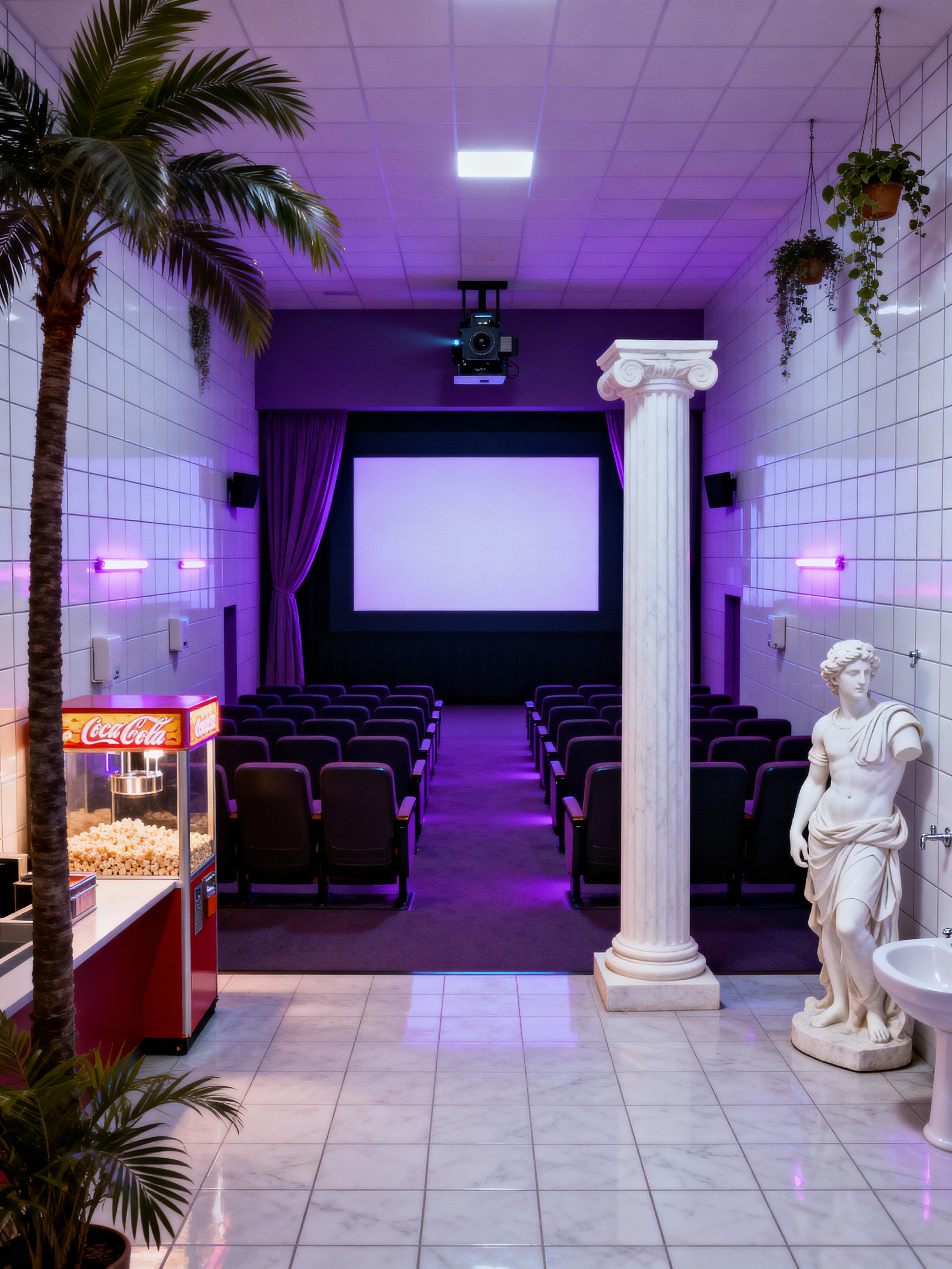cinema with vaporwave style with popcorn machine and curtains and dim lighting and theater seats and aisles and projector and movie screen and concession stand. . with palm trees and purple lights and white roman statues, white roman sculptures, white roman columns, white roman pillars in the center of the room, and hanging plants and white square bathroom tiles and purple lights and washed out colors and purple lights