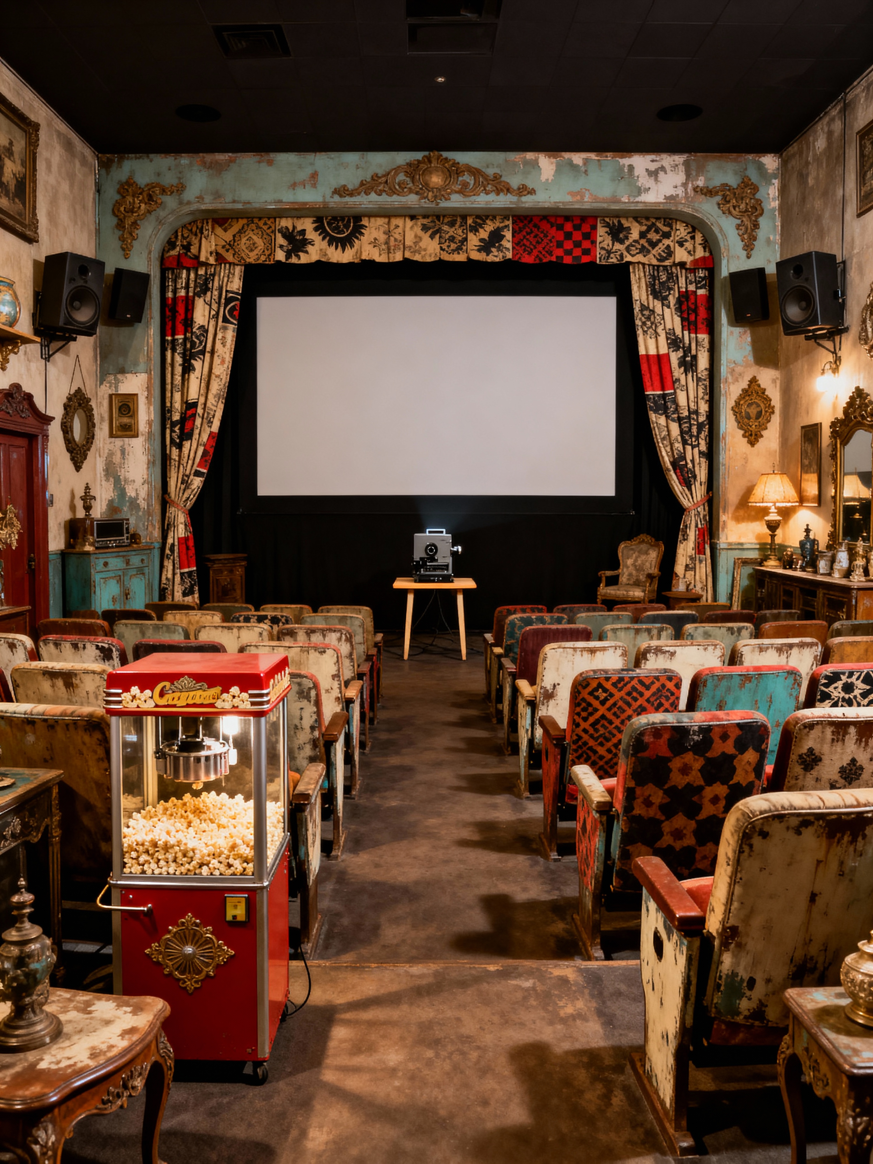 cinema with vintage style with popcorn machine and movie screen and aisles and curtains and dim lighting and theater seats and projector and surround sound speakers. . with eclectic and upcycled furniture and shabby chic and bold patterns and antique decor and ornate details and timeless pieces and retro style
