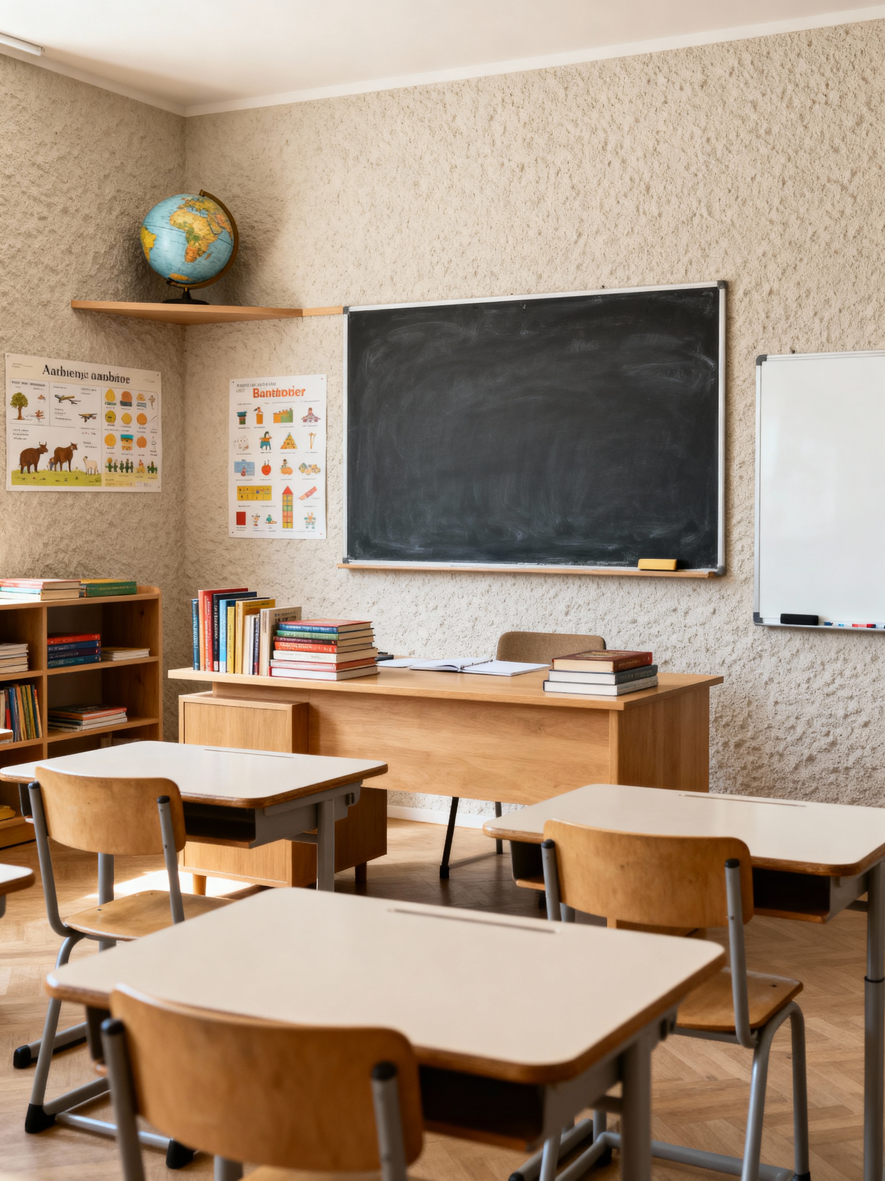 classroom with airbnb style with globe and teacher desk and chalkboard and books and educational posters and chairs and whiteboard and desks. . with simple, clean lines and simplistic furniture and simple color palette and practicality and functionality and open and natural lighting and neutral walls and textures and natural materials and elements and scandinavian style and simple, clean lines and simplistic furniture
