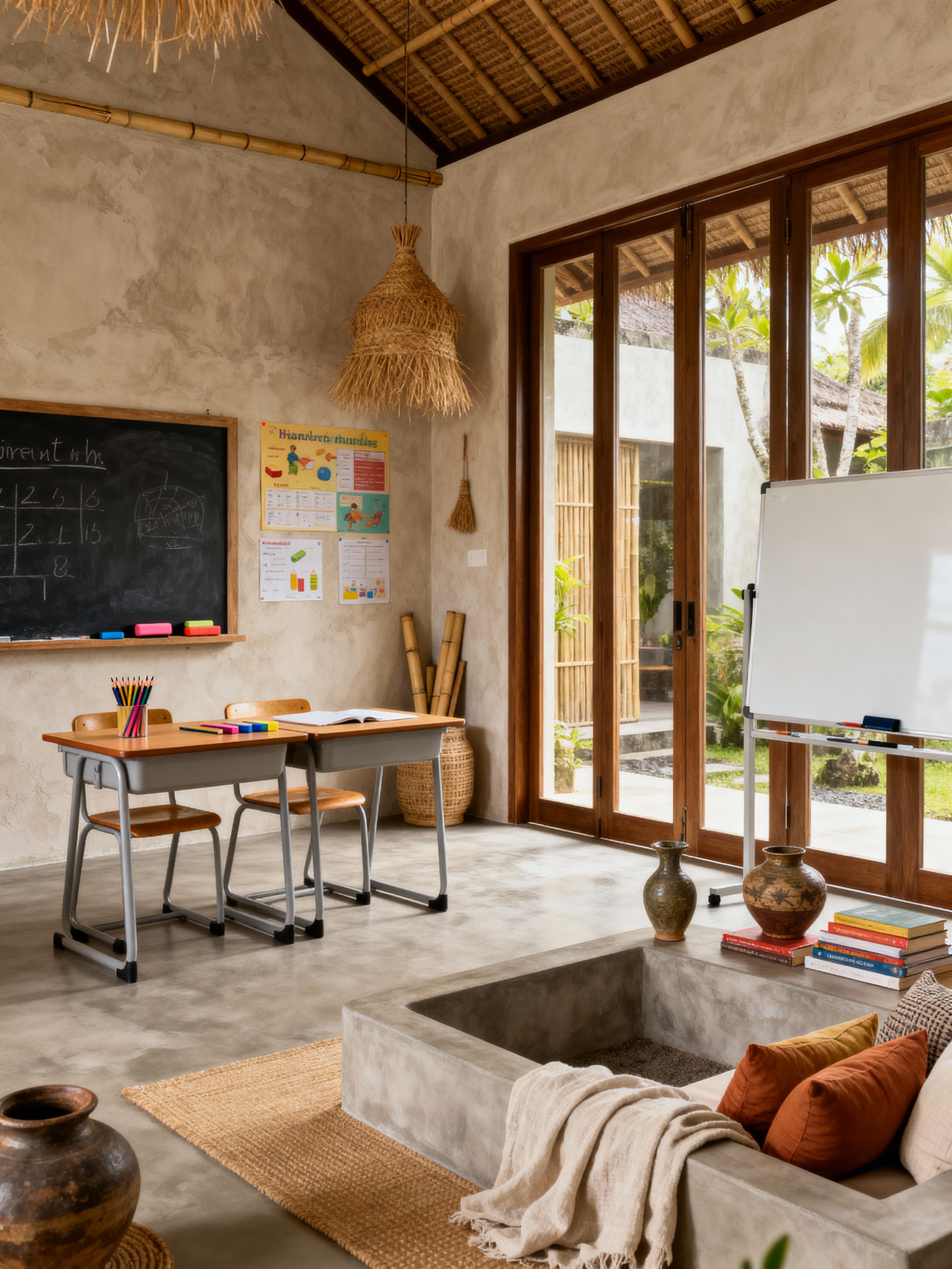 classroom with bali style with pencils and desks and chalkboard and educational posters and erasers and books and chairs and whiteboard. . with textured plaster or stucco finish and neutral color palette and raffia or bamboo accents and microcement floors and indoor-outdoor flow with glass doors and linen or cotton fabrics and handcrafted pottery and vases and conversation pit with pillows