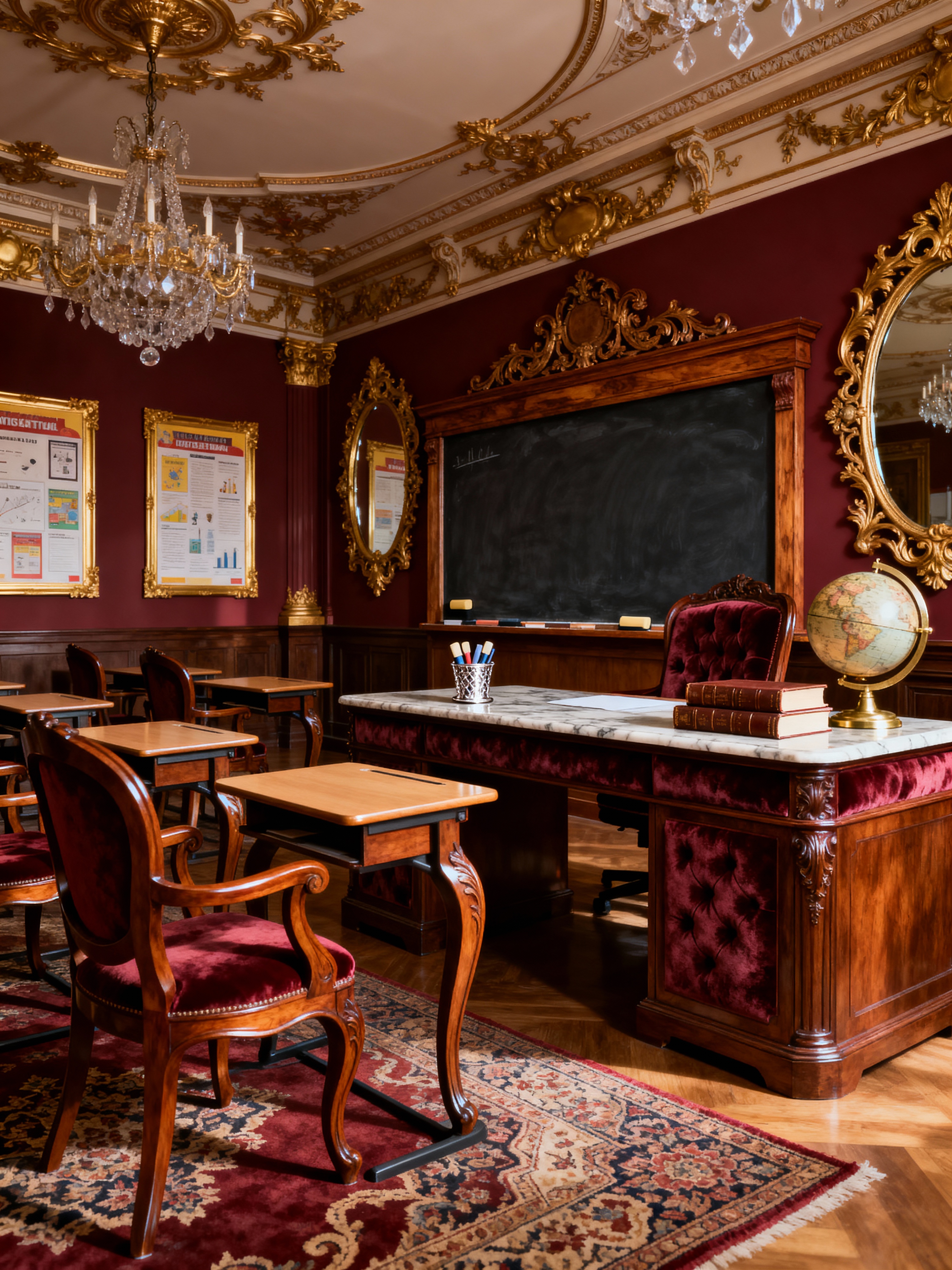 classroom with baroque style with chairs and desks and educational posters and chalkboard and erasers and teacher desk and books and globe. . with elaborate ornamentation and tension and sensuous richness and movement and expensive and plush flooring and dynamism and grandeur and intricate carvings and ornaments