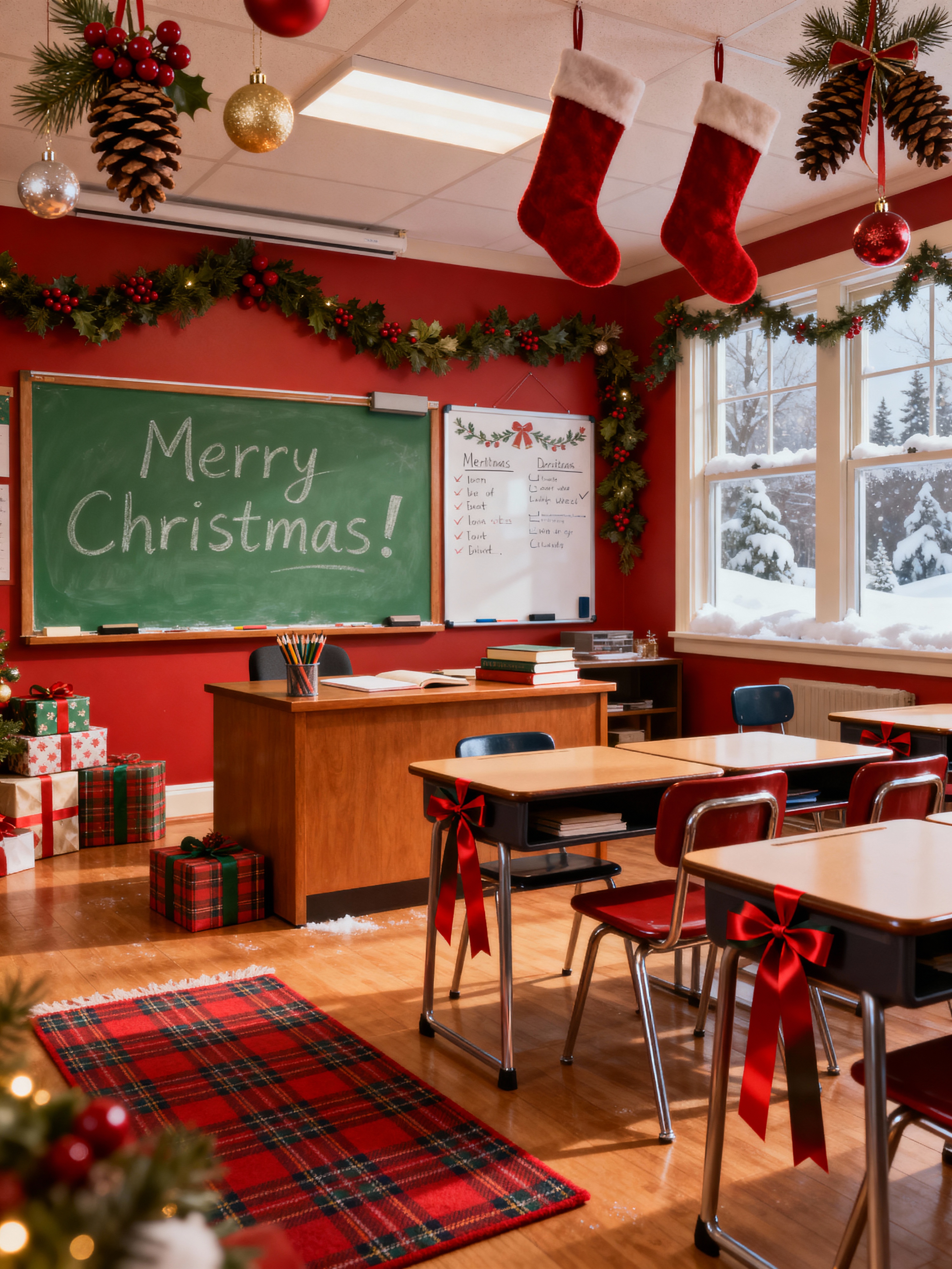 classroom with christmas style with erasers and chalkboard and teacher desk and whiteboard and chairs and desks and pencils and books. . with giftwrapped gifts and snow outside and a few big socks hanging and berries and greenery draped and plaid rugs and ribbons and christmas ornaments and tie pinecones and berries