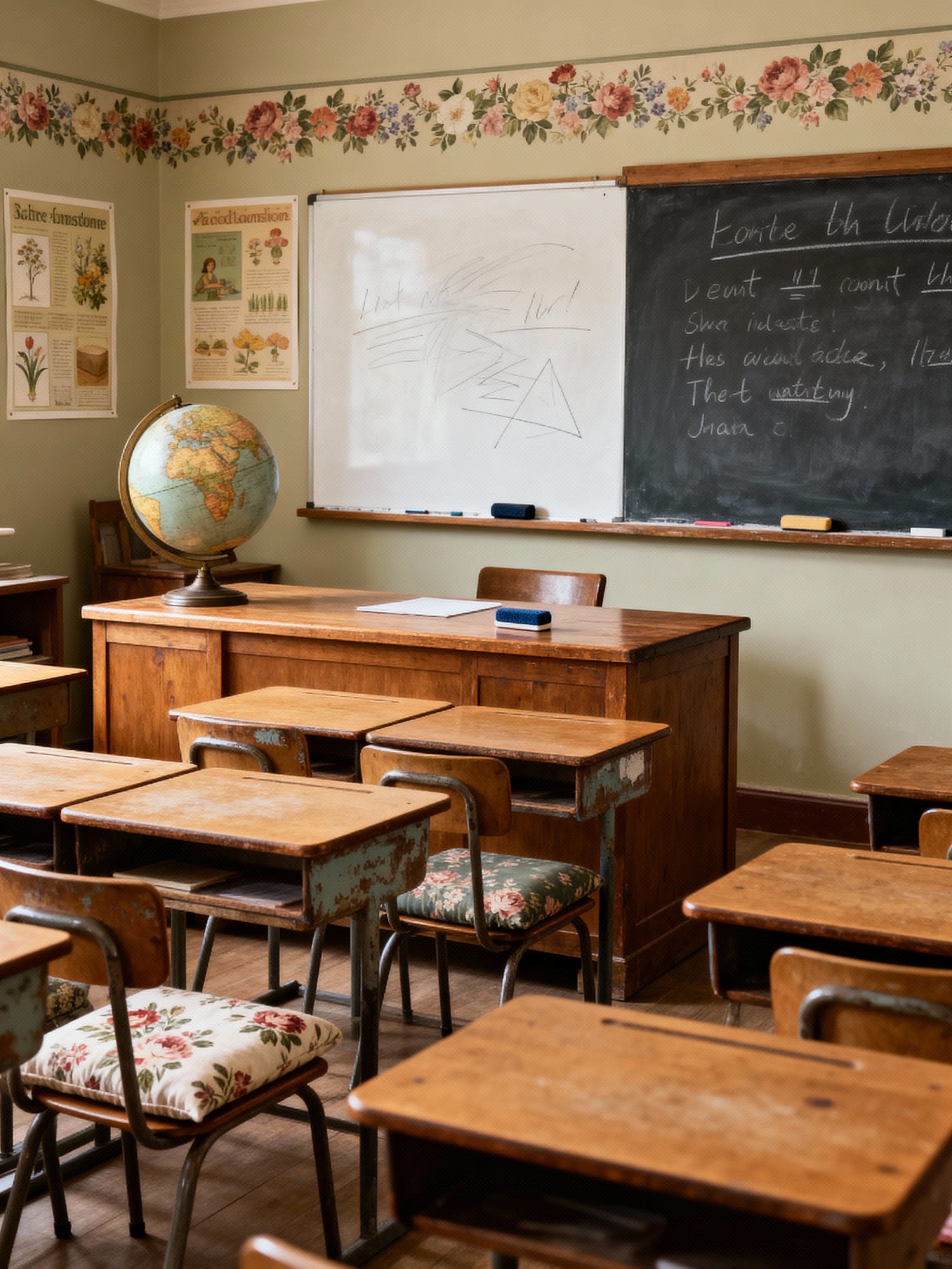 classroom with cottagecore style with teacher desk and whiteboard and erasers and desks and globe and chairs and educational posters and chalkboard. . with earthy and floral patterns and rustic and traditional and country style and organic and muted colors and cottage style