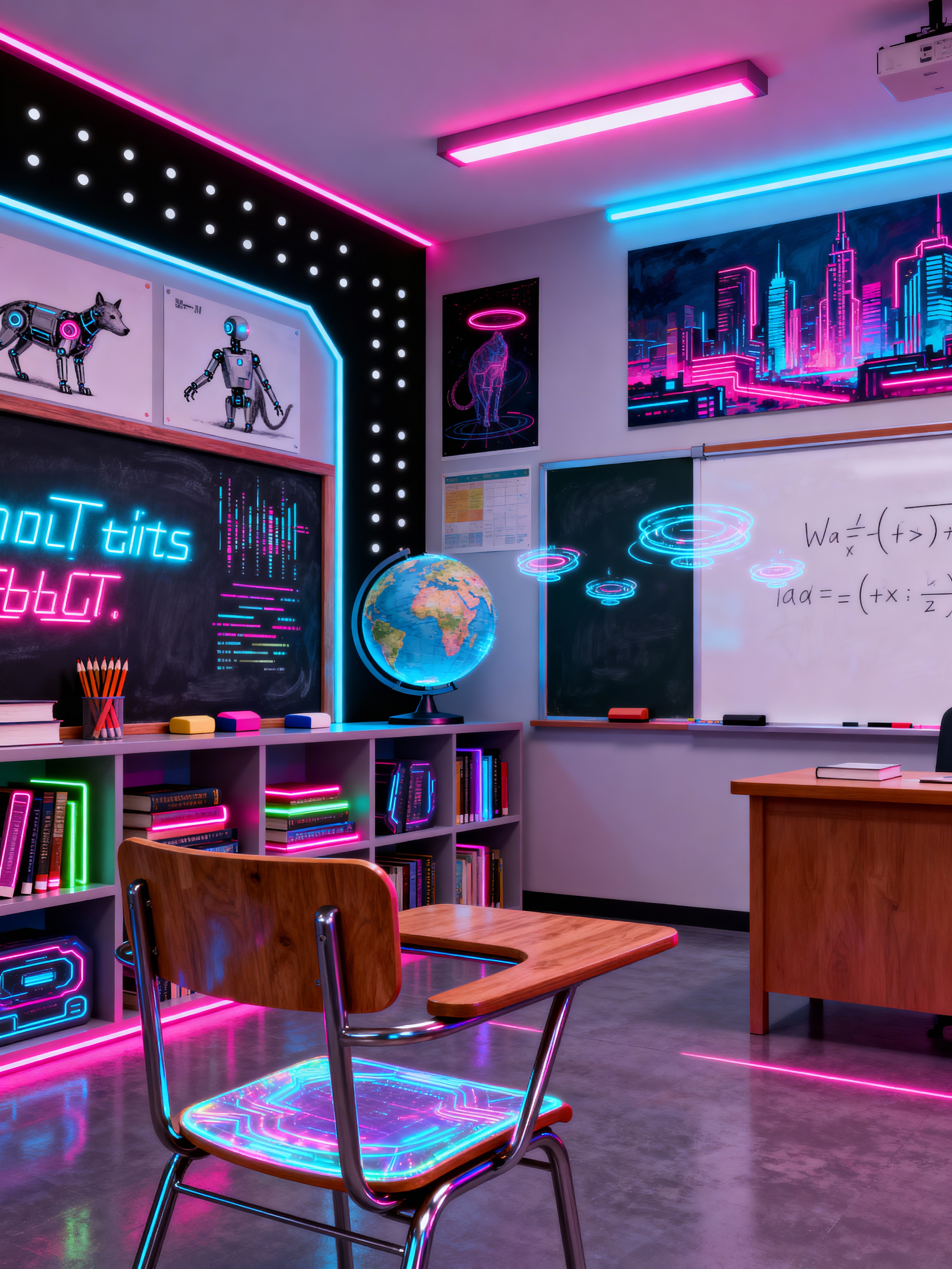 classroom with cyberpunk style with chalkboard and chairs and books and pencils and erasers and educational posters and globe and whiteboard. . with color lights glow and surrealist paintings and futuristic cybernetic city and led lights and black lights and strong geometric walls and cyberpunk style and synthwave