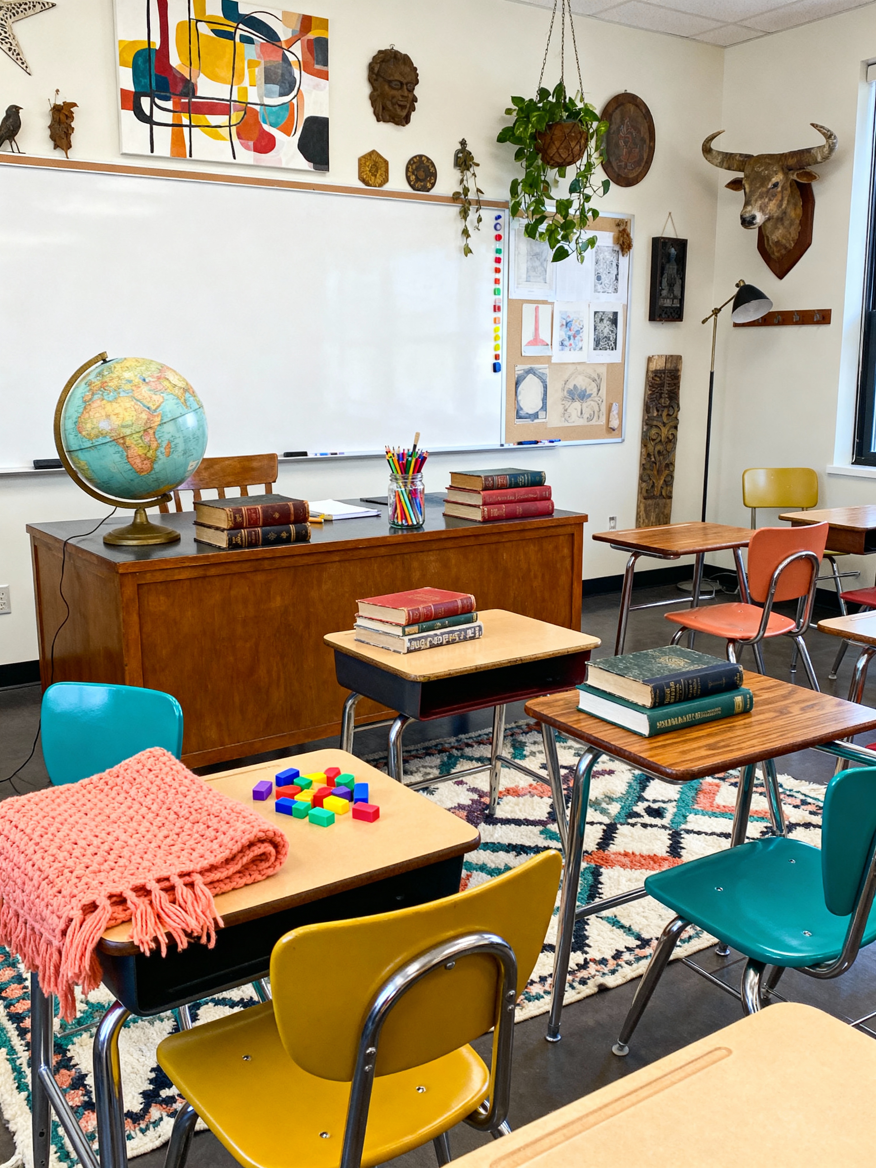 classroom with eclectic style with chairs and globe and erasers and pencils and books and whiteboard and teacher desk and desks. . with bold combinations and creative freedom and artistic flair and vintage finds and layered textures and colorful palette and mixed styles and unexpected elements