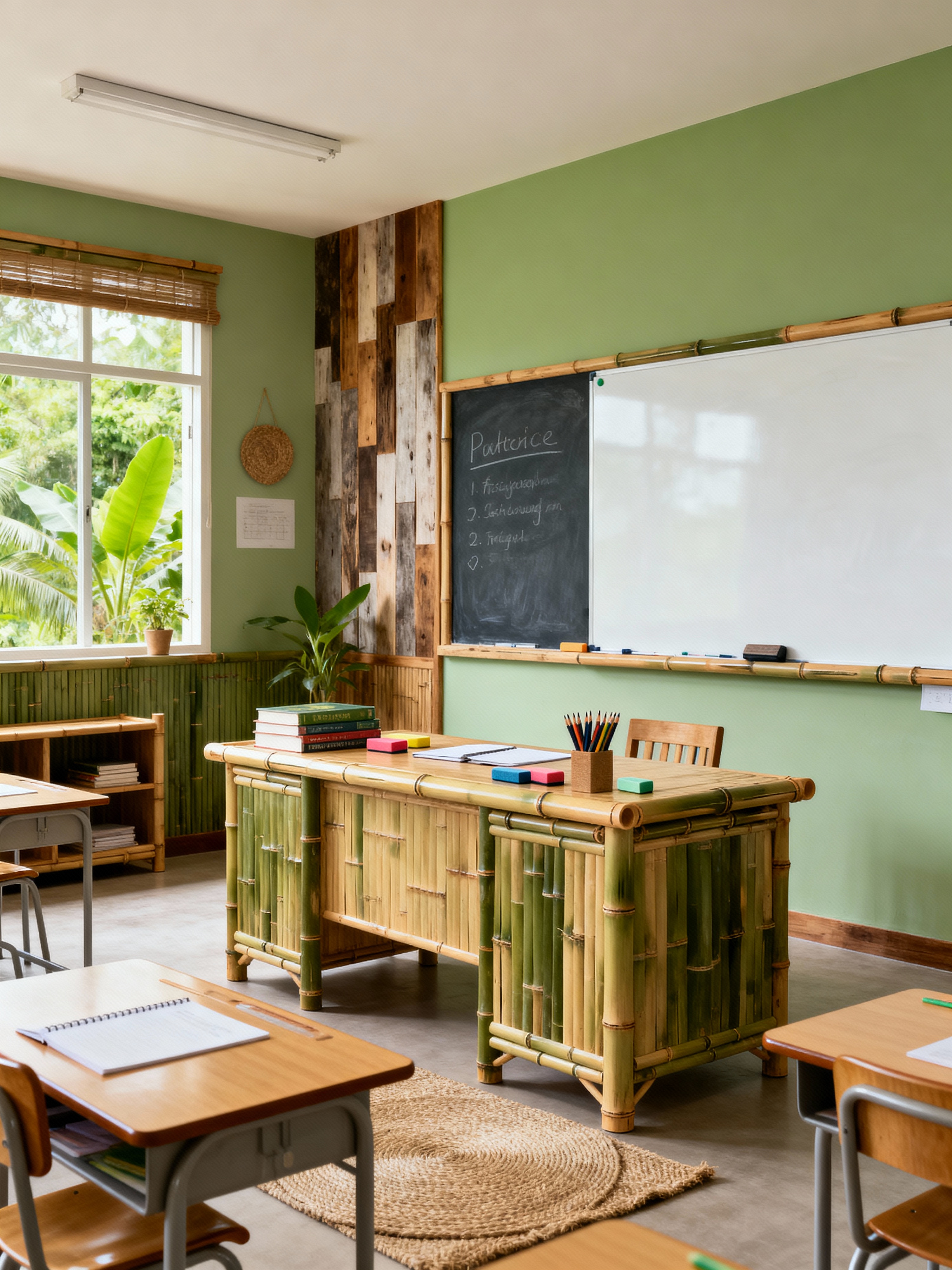 classroom with eco-friendly style with teacher desk and books and erasers and whiteboard and desks and chalkboard and pencils and chairs. . with recycled elements and non-toxic finishes and bamboo furniture and green living and renewable resources and reclaimed wood and environmentally conscious and natural fibers