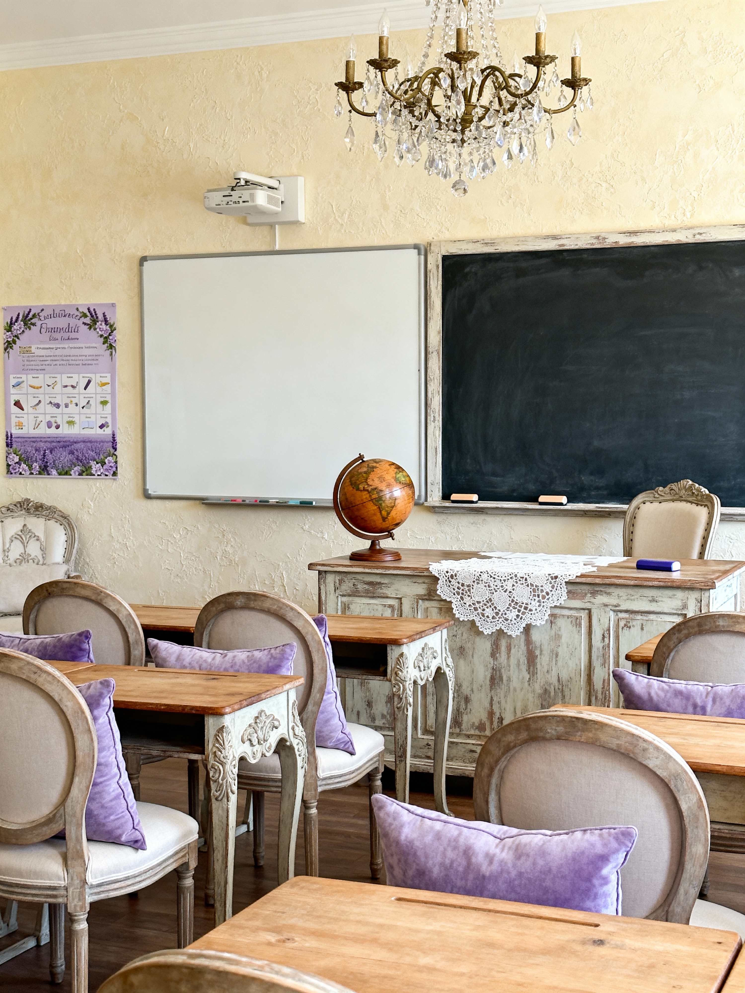 classroom with french country style with whiteboard and chalkboard and erasers and educational posters and desks and chairs and teacher desk and globe. . with soft fabrics and ornate details and chandeliers and elegant rustic and textured walls and antique decor and distressed wood and lavender accents