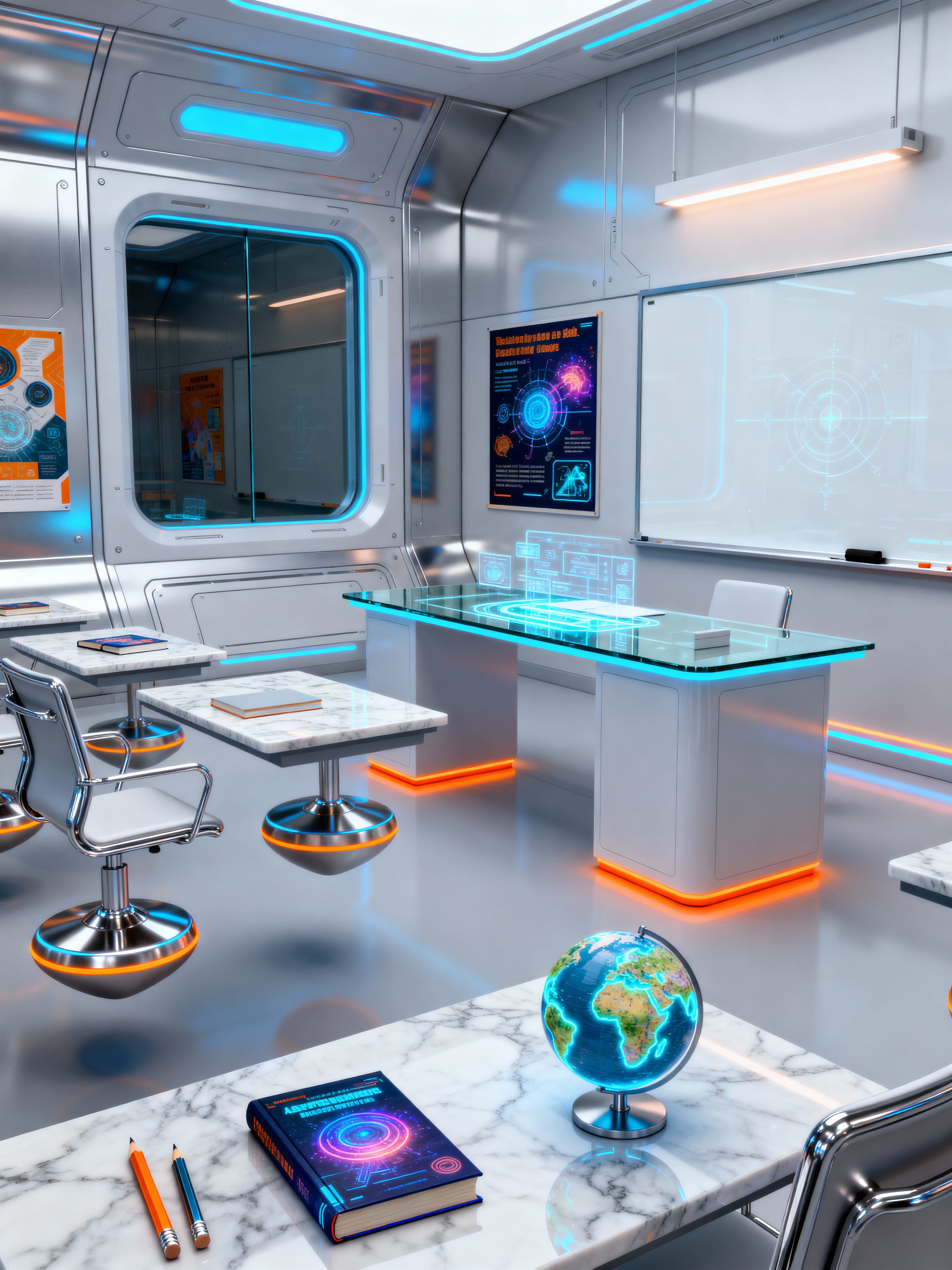 classroom with futuristic style with chairs and pencils and books and globe and teacher desk and educational posters and whiteboard and desks. . with futurism and steel finishing and neutral background and bright accents and floating surfaces and smooth polished marble and minimalist clean lines and glass panes and spaceship interior