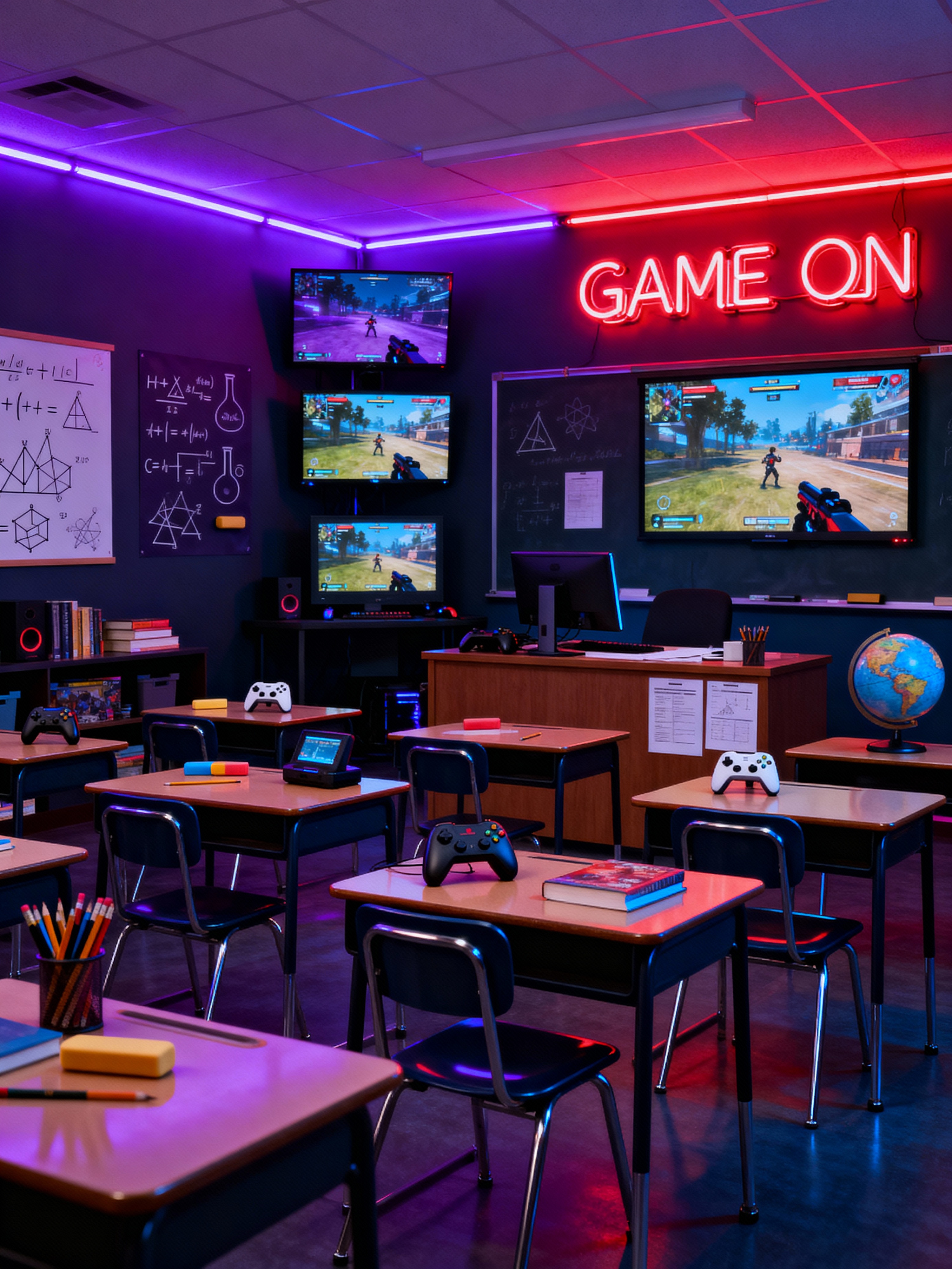 classroom with gaming room style with erasers and educational posters and chairs and globe and pencils and desks and books and teacher desk. . with neon lights and neon letters on wall and multiple displays and at night and video game consoles and dark room and purple, red and blue fade light and purple and red lights