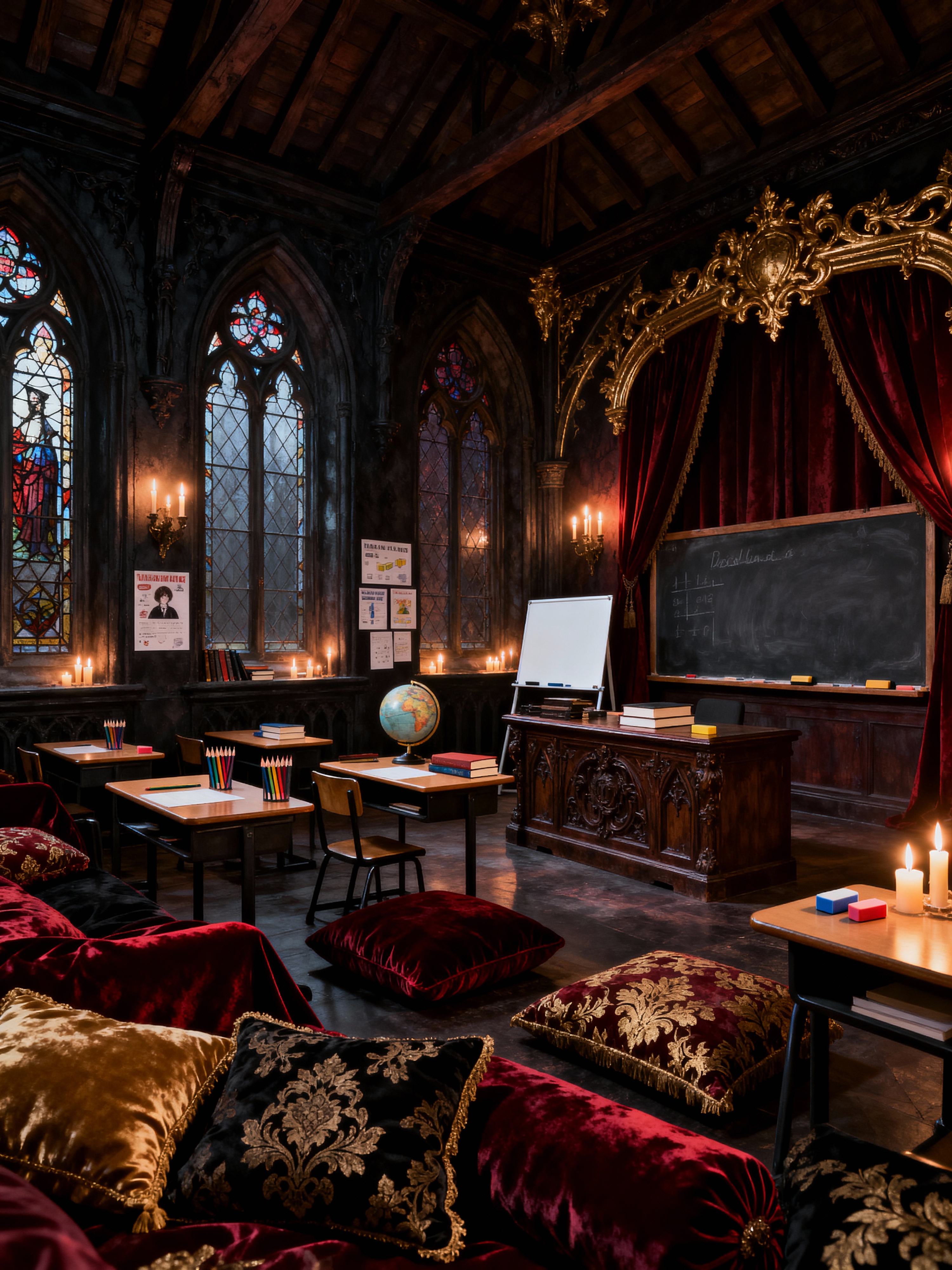 classroom with gothic style with chalkboard and pencils and educational posters and books and globe and whiteboard and erasers and desks. . with rich fabrics and cathedral style and ornate details and mysterious mood and dark colors and arched windows and candlelit ambiance and heavy furniture