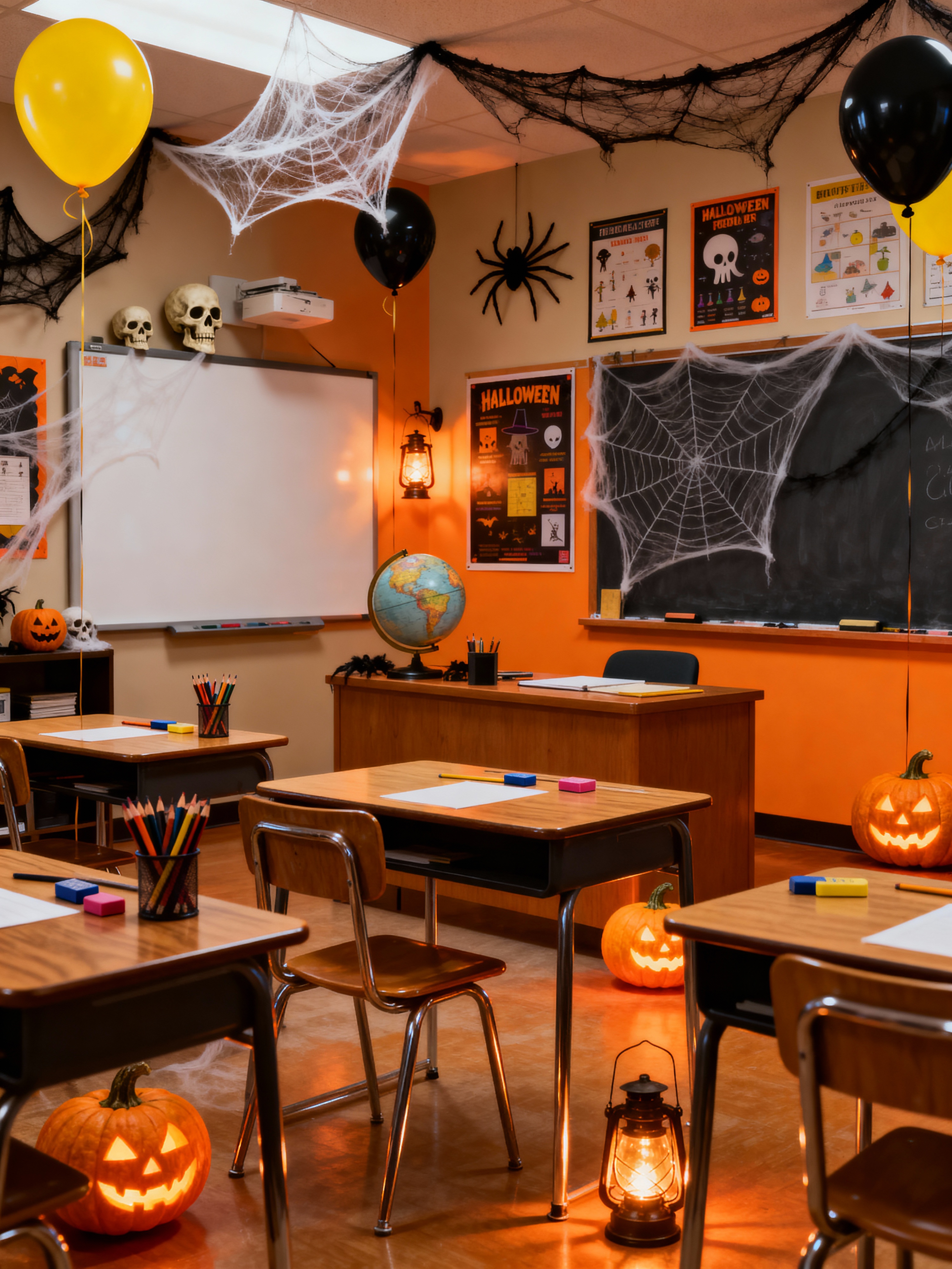 classroom with halloween style with pencils and desks and educational posters and globe and chairs and erasers and chalkboard and whiteboard. . with lanterns and yellow black balloons and cobwebs and human skulls and lanterns and glowing pumpkins and cobwebs and spiderwebs