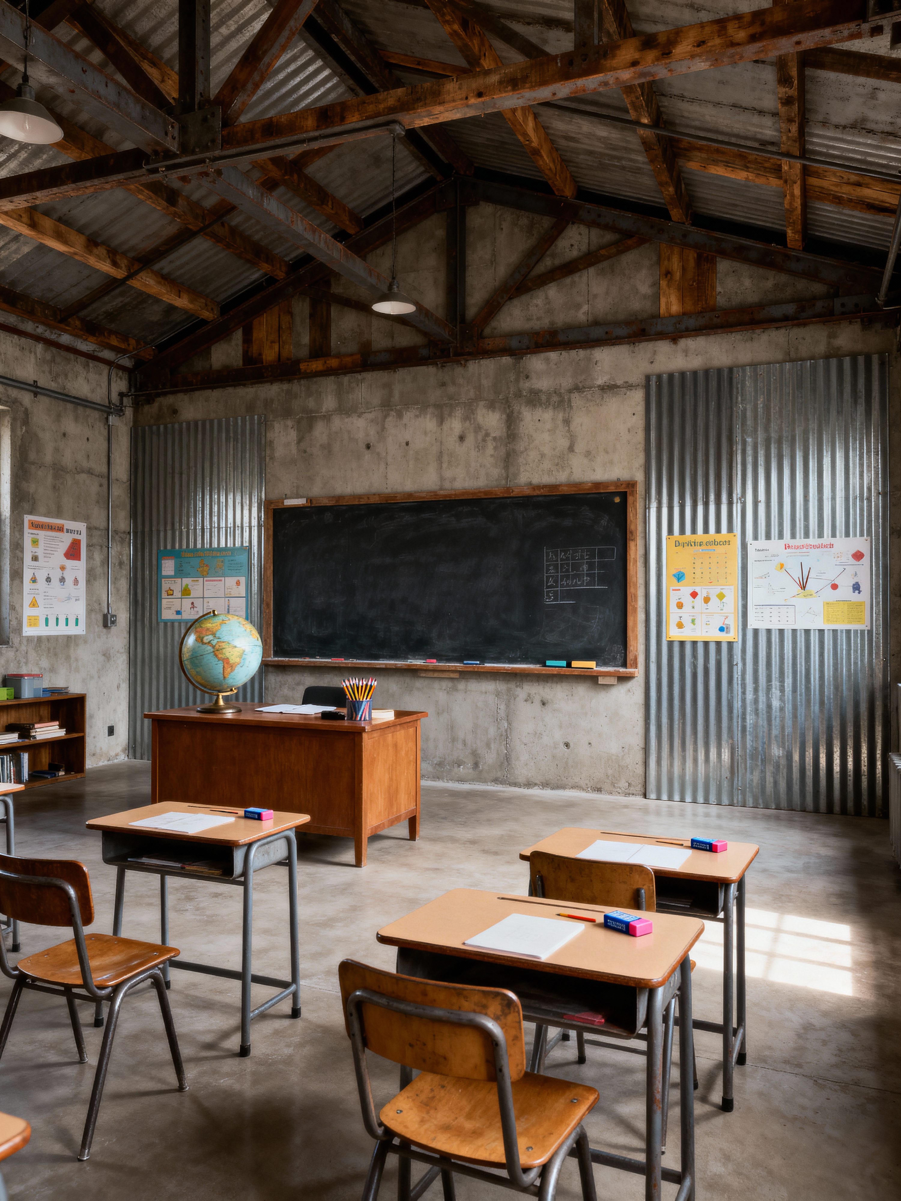 classroom with industrial style with chairs and teacher desk and globe and educational posters and pencils and erasers and desks and chalkboard. . with raw aesthetic and utilitarian objects and factory style and reclaimed wood and exposed concrete and open floorplan and exposed rafters and metal panels
