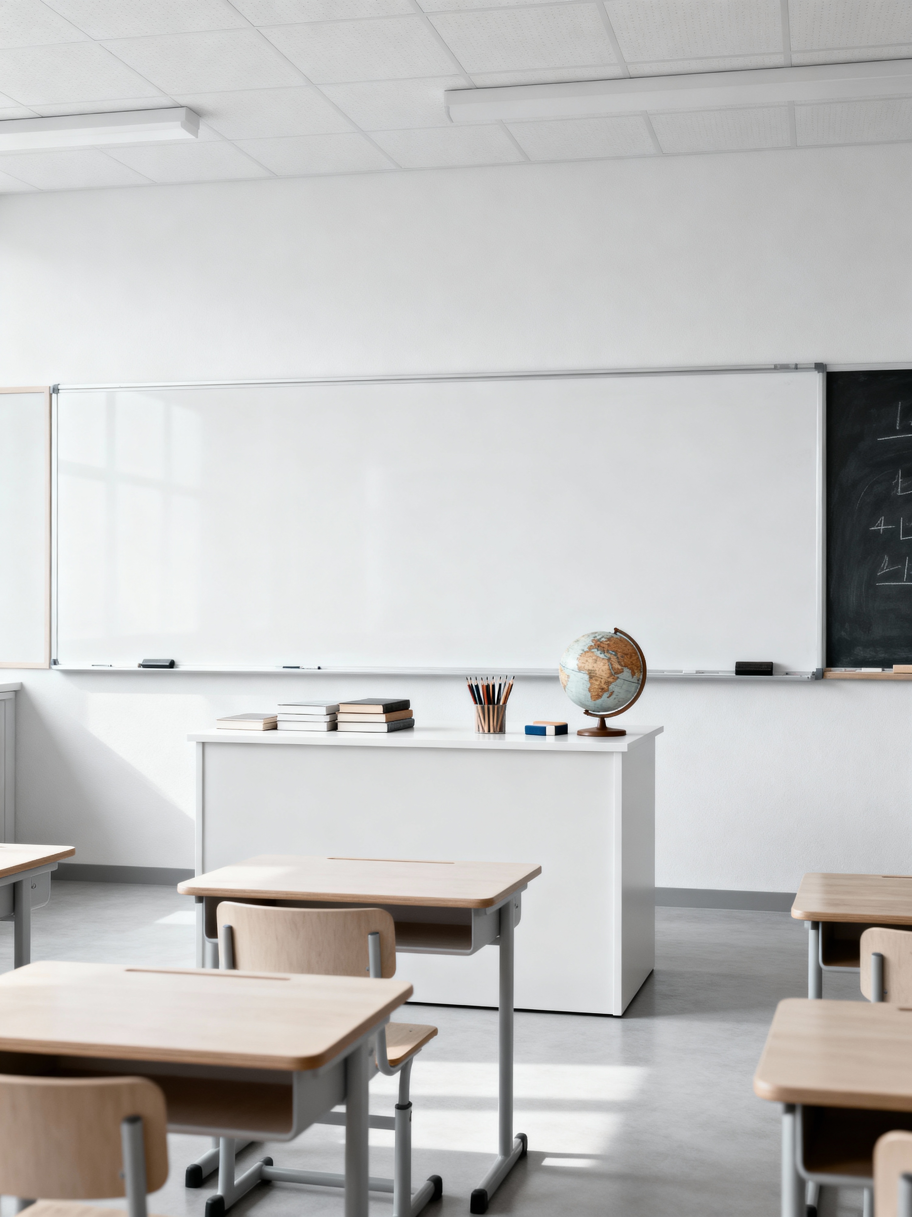 classroom with minimalist style with whiteboard and pencils and books and globe and desks and teacher desk and erasers and chalkboard. . with an open floor plan and focus on the shape, colour and texture of just a few of essential elements and lots of light and clean lines and functional furniture and a monochromatic palette with colour used as an accent and an open floor plan