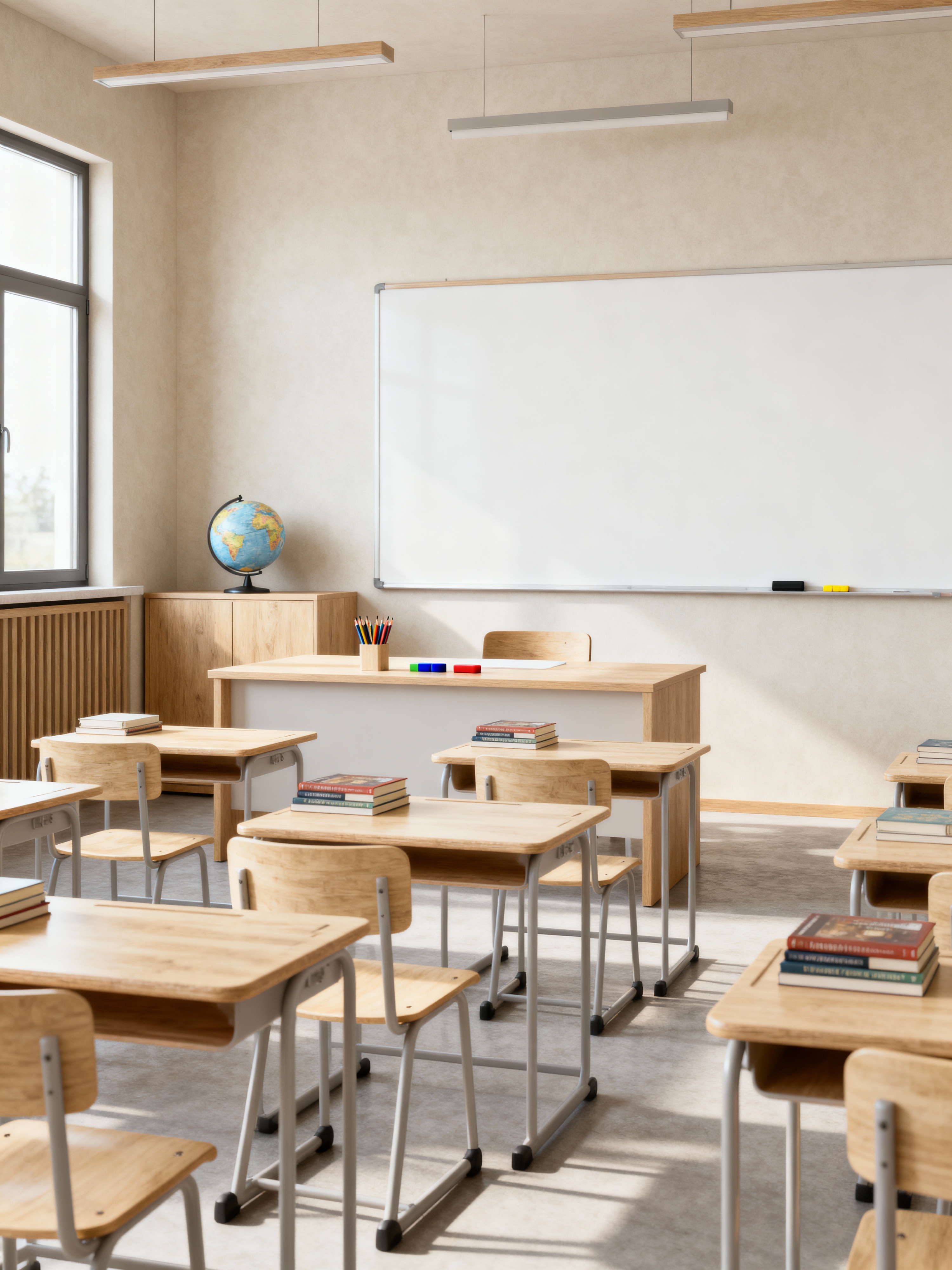 classroom with modern style with erasers and pencils and whiteboard and teacher desk and desks and books and globe and chairs. . with natural materials and elements and open and natural lighting and practicality and functionality and simple, clean lines and simplistic furniture and neutral walls and textures and natural materials and elements