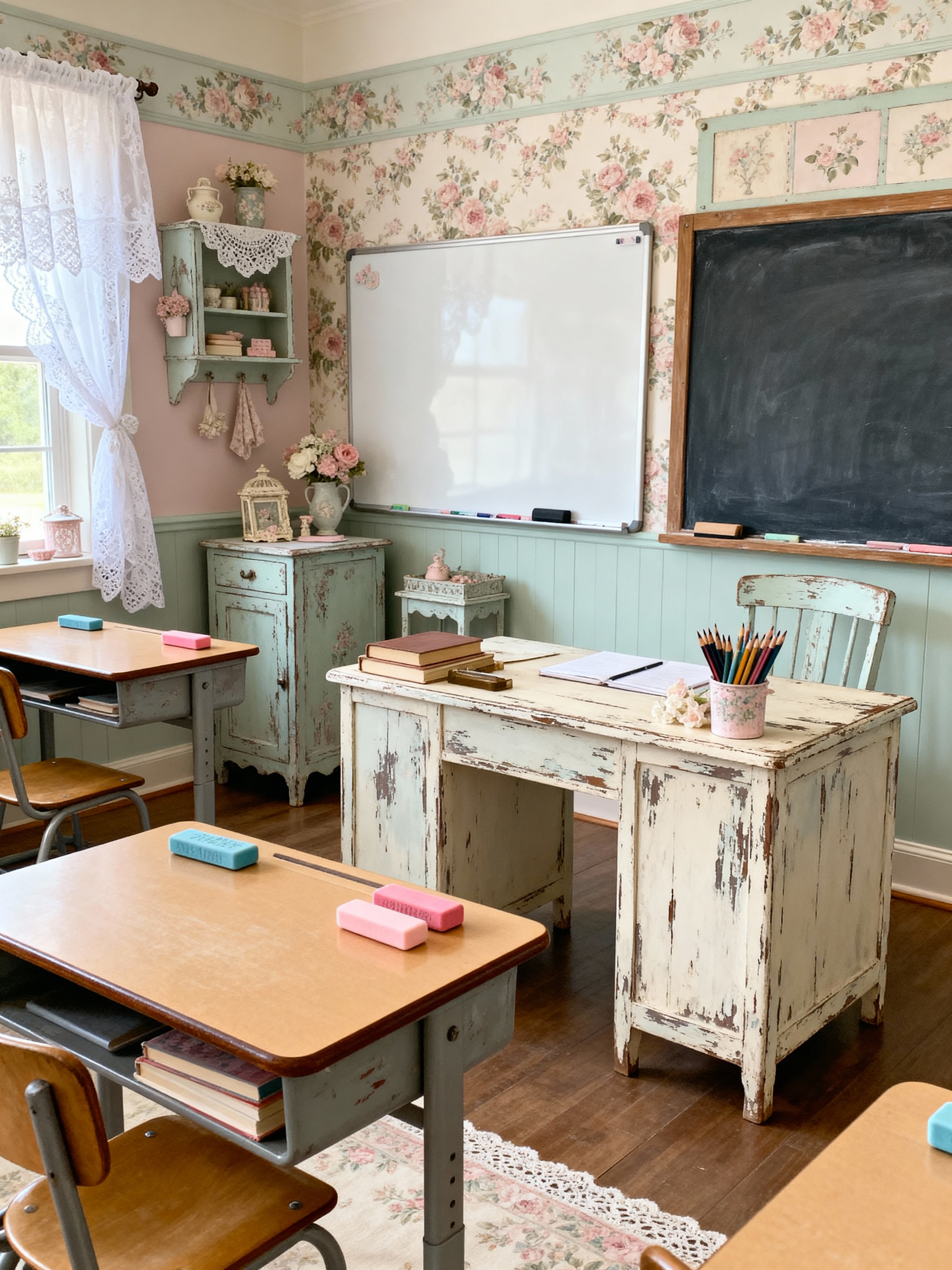 classroom with shabby chic style with desks and erasers and books and whiteboard and chairs and teacher desk and pencils and chalkboard. . with delicate details and soft textures and cottage feel and feminine touches and weathered finishes and vintage charm and distressed furniture and floral patterns