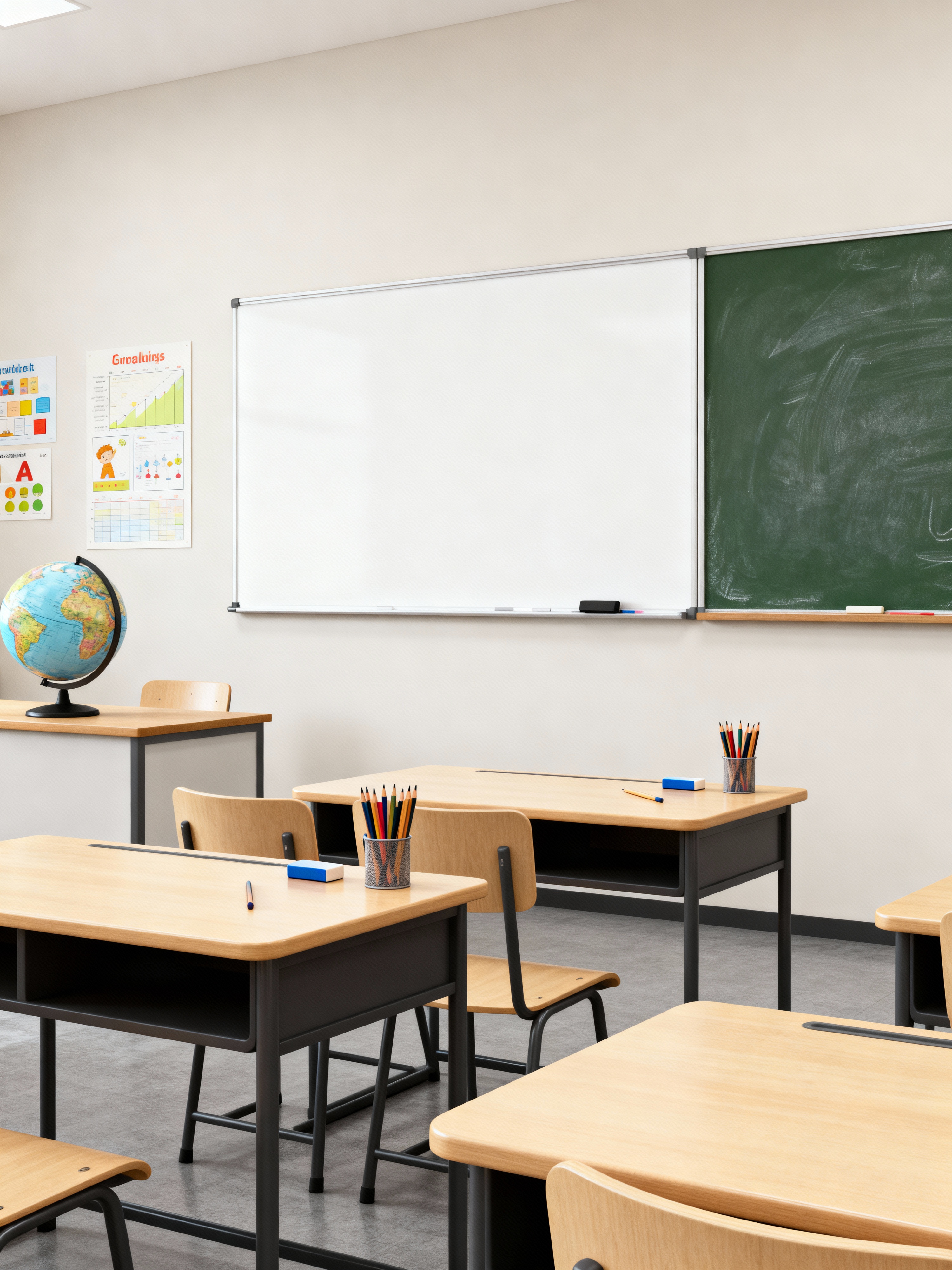 classroom with simple style with globe and desks and pencils and chairs and erasers and whiteboard and chalkboard and educational posters. . with essential pieces and minimal decor and clean design and understated style and calm atmosphere and basic elements and uncluttered space and functional furniture