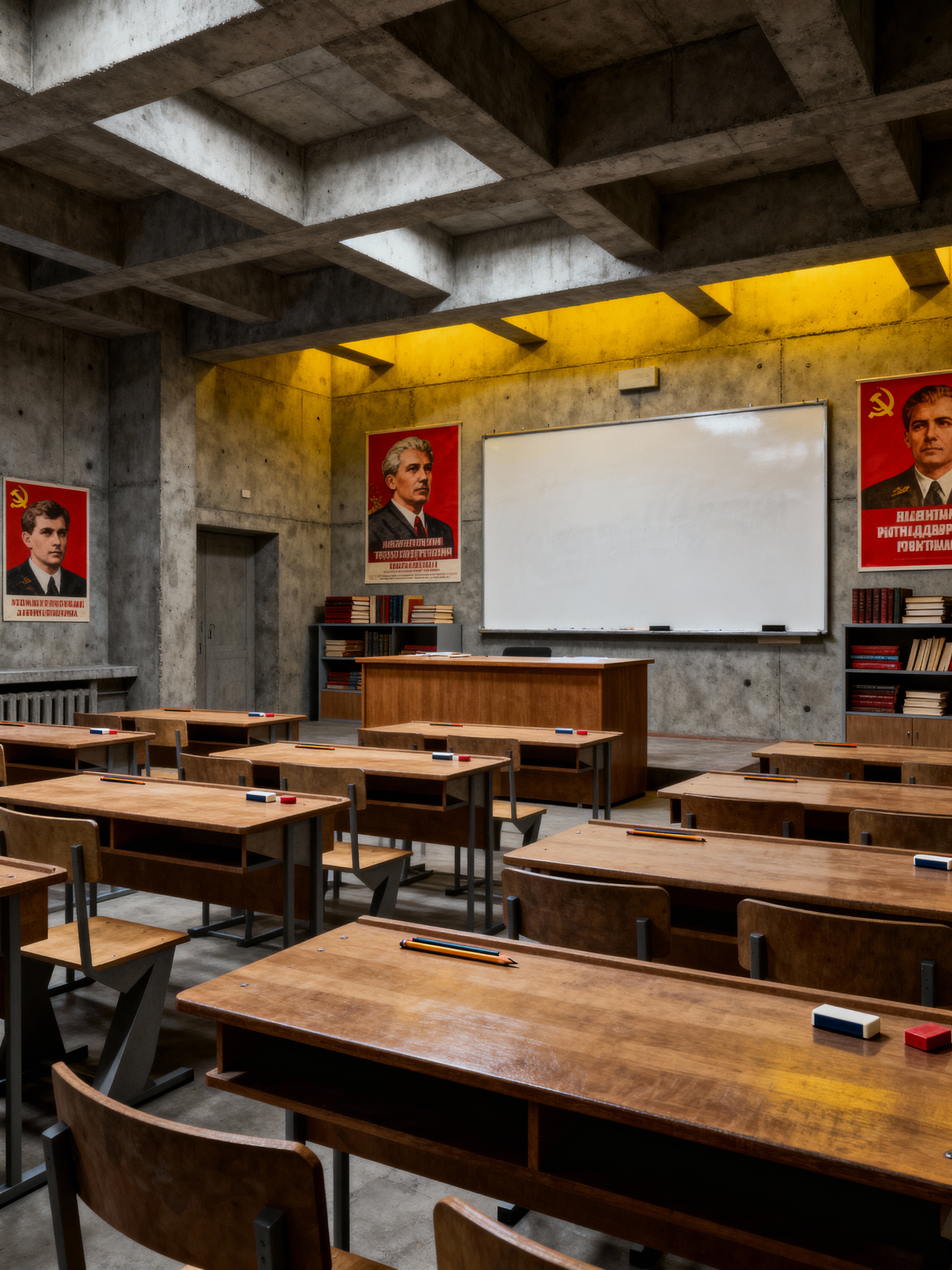 classroom with soviet style with chairs and whiteboard and pencils and desks and teacher desk and erasers and educational posters and books. . with austere aesthetic and concrete structures and soviet-era architecture and communist design and eastern bloc and brutalist style and monumental scale and socialist realism