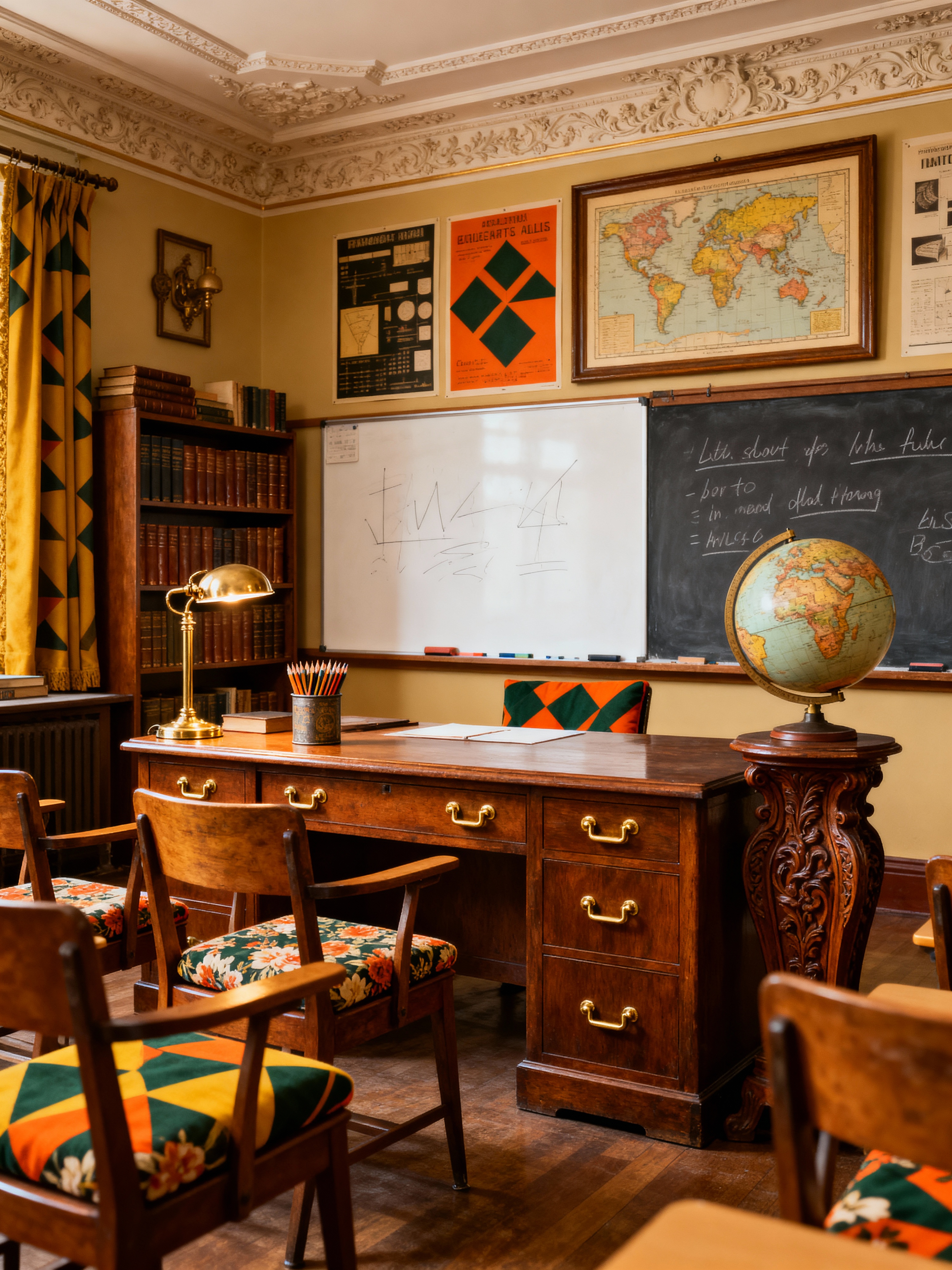 classroom with vintage style with whiteboard and globe and books and teacher desk and chairs and pencils and educational posters and chalkboard. . with eclectic and nostalgic feel and ornate details and antique decor and colorful accents and mid-century and bold patterns and retro style