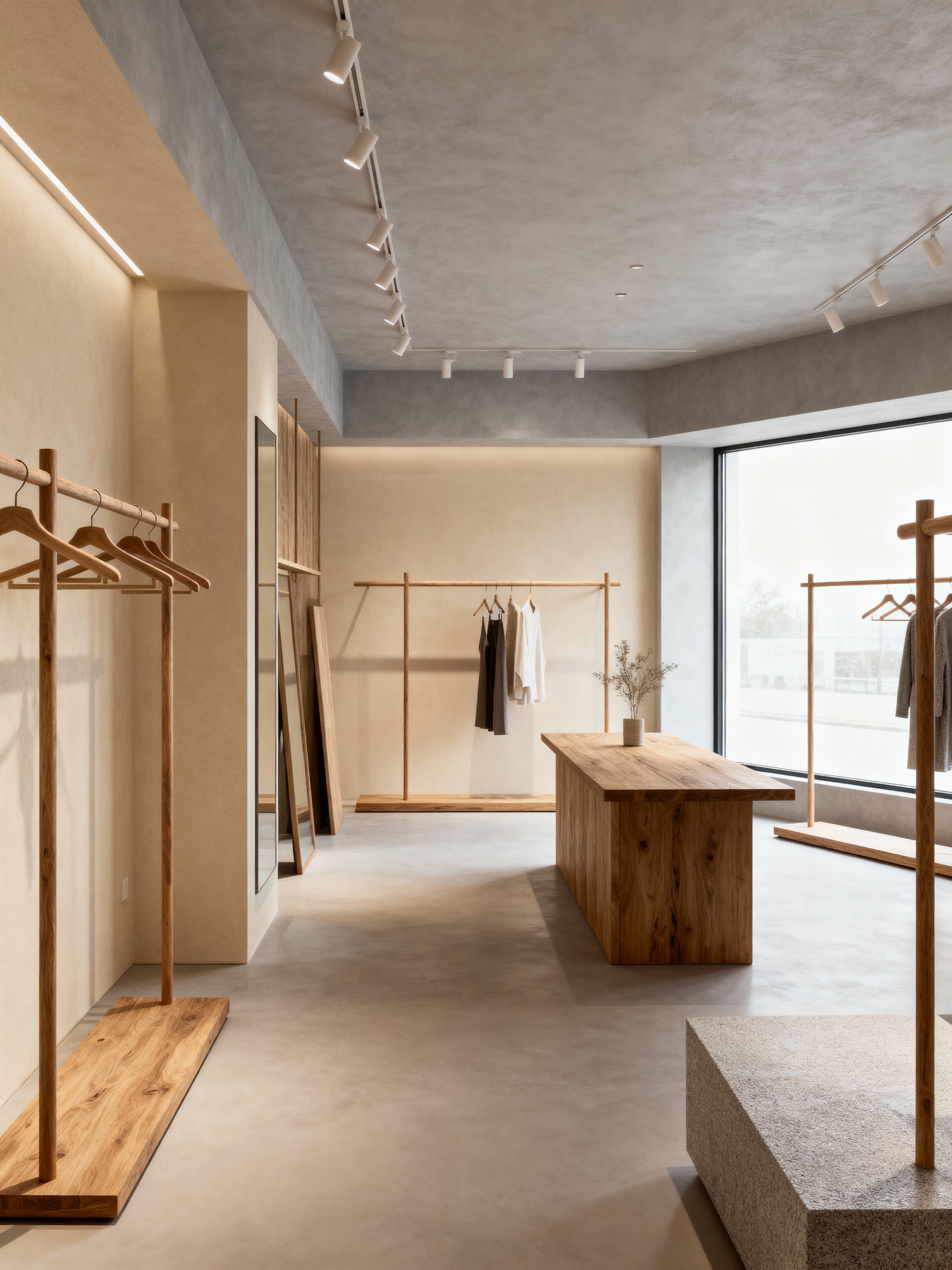 clothing store with airbnb style . with practicality and functionality and open and natural lighting and scandinavian style and simple, clean lines and simplistic furniture and natural materials and elements and simple color palette and neutral walls and textures and practicality and functionality