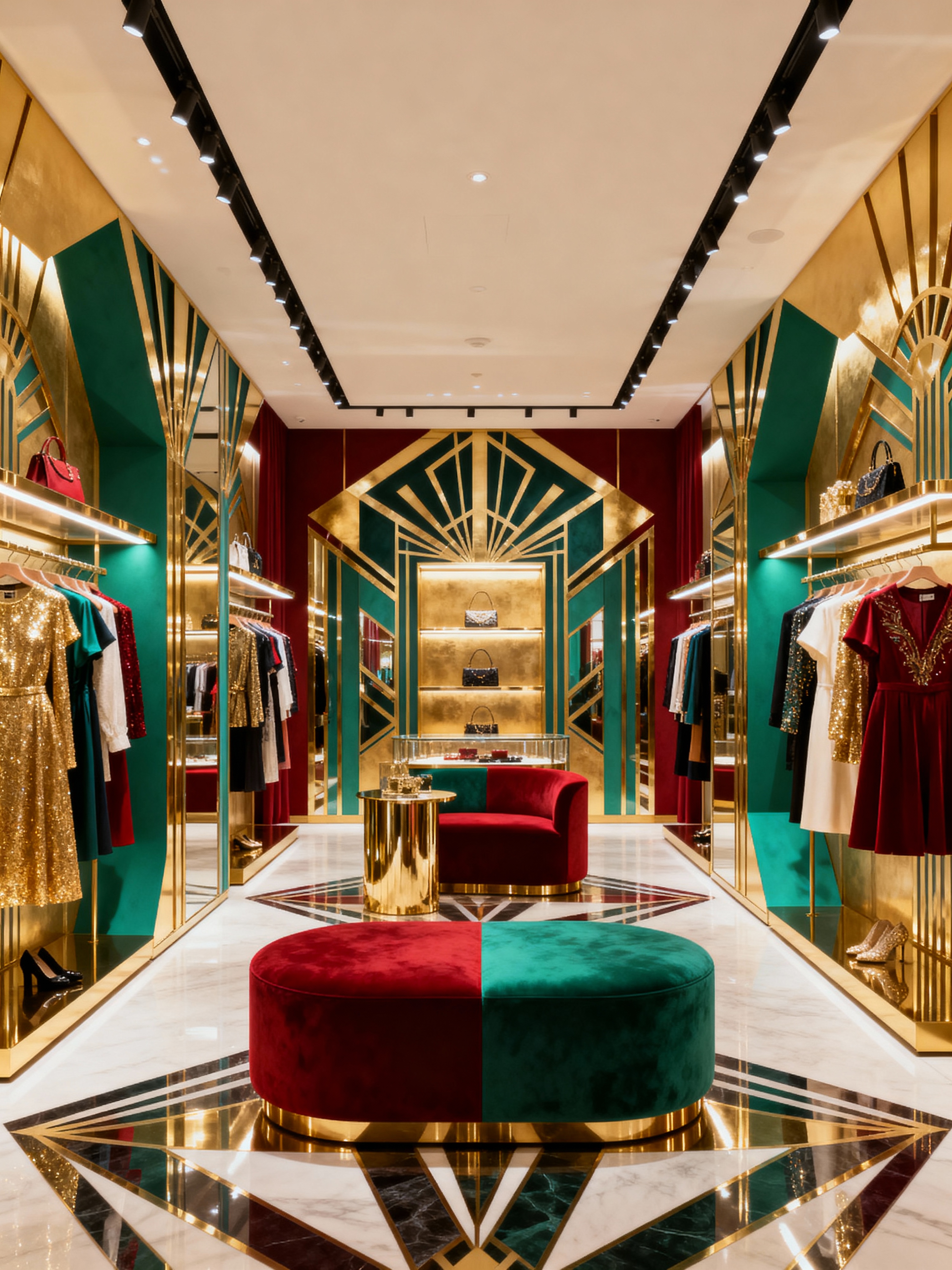 clothing store with art deco style . with luxury and glamour and bright and cheerful colors and exuberant shapes and smooth lines and angular shapes and rich colors and symmetrical designs