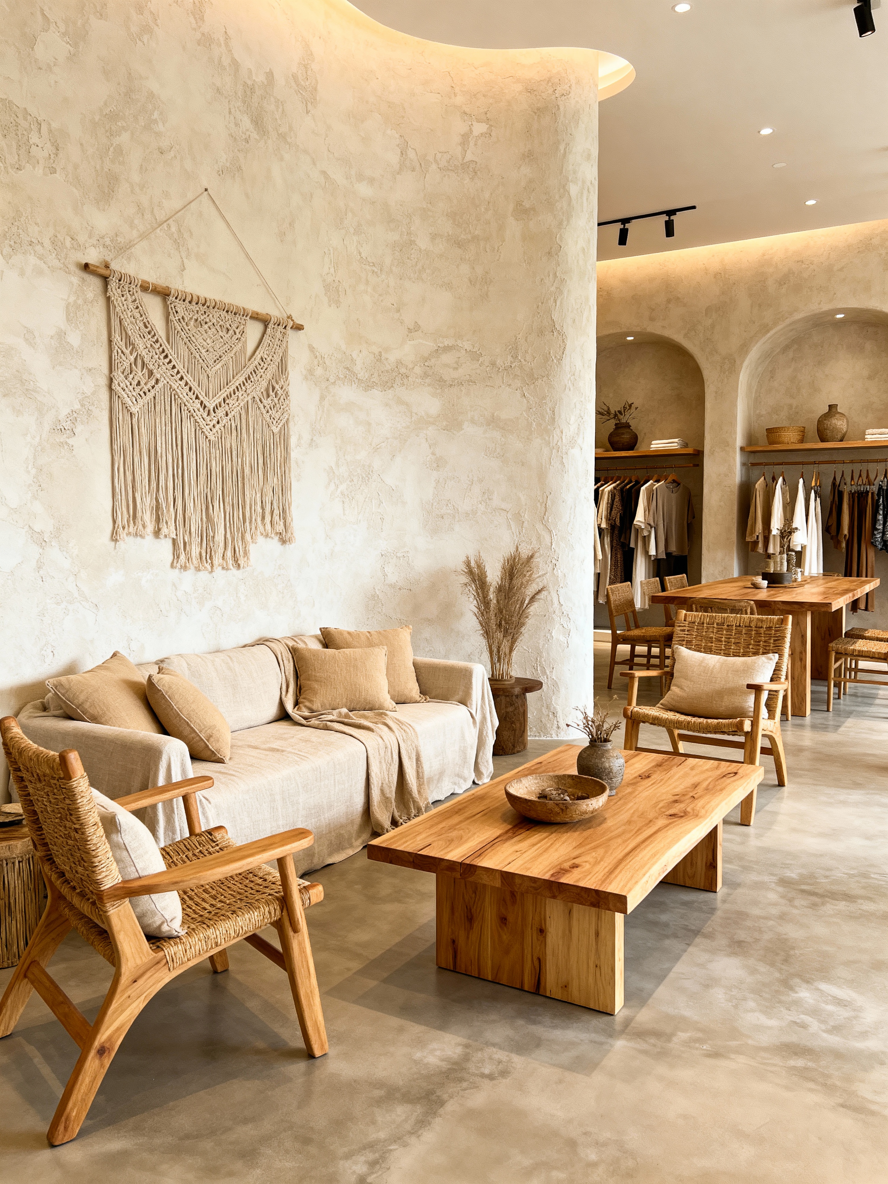 clothing store with bali style . with textured plaster or stucco finish and beige and sand tone cushions and modern boho chic and wooden coffee and dining tables and microcement floors and light wood furniture (teak, oak) and linen or cotton fabrics and rattan chairs and decor