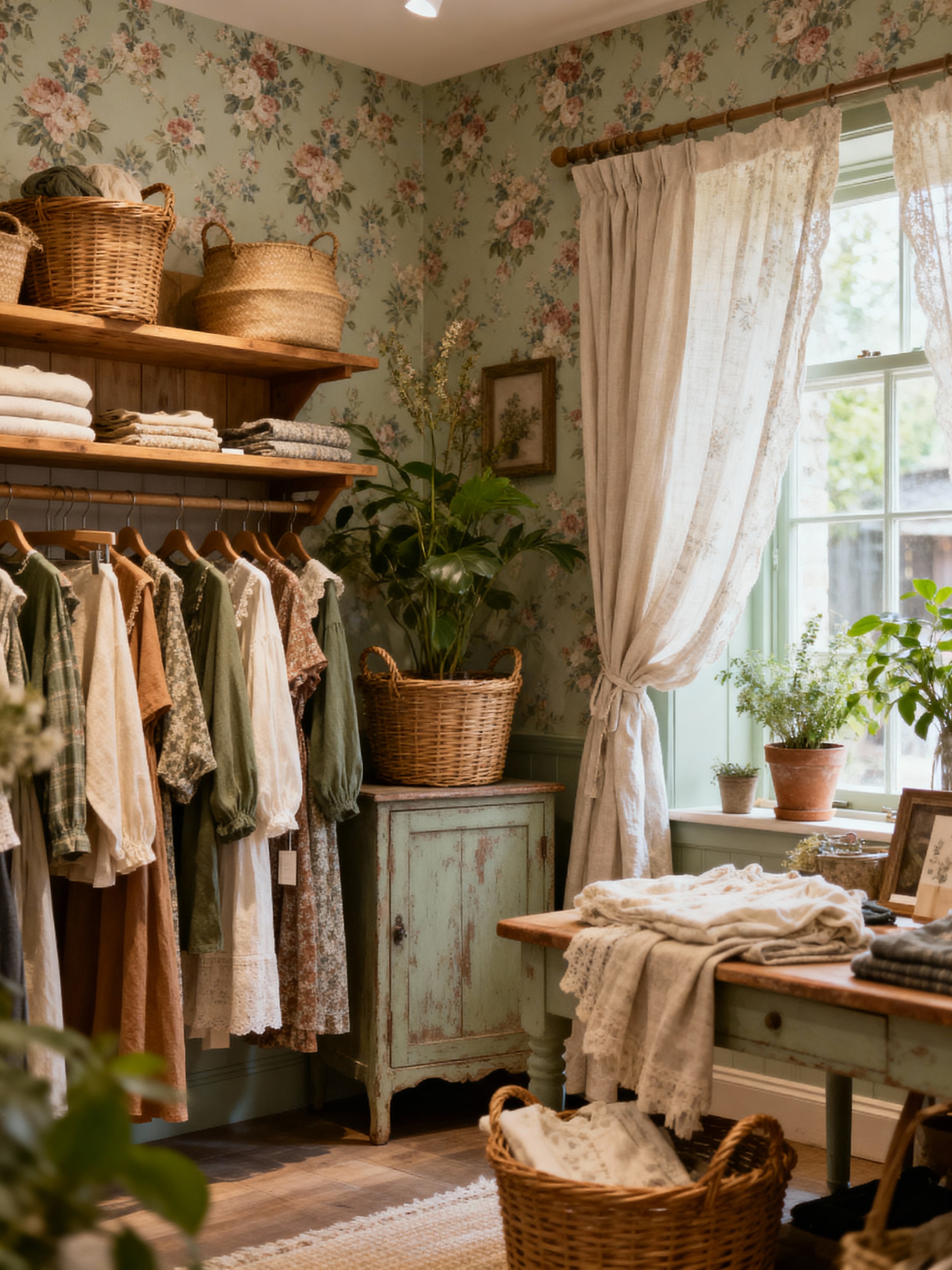 clothing store with cottagecore style . with organic and muted colors and country style and floral patterns and earthy and cottage style and rustic and natural