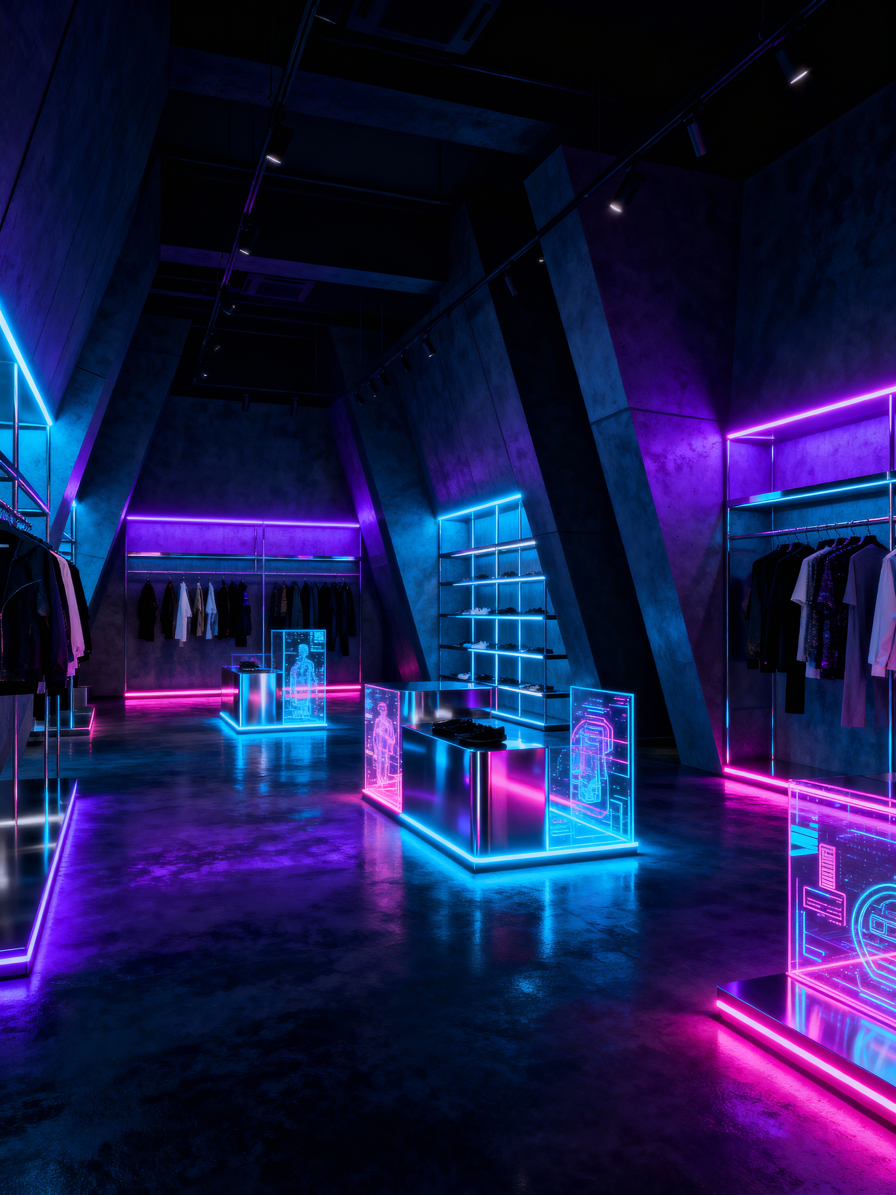 clothing store with cyberpunk style . with cyberpunk lights and dark night and cyberpunk lights and strong geometric walls and bladerunner style and color lights glow and synthetic objects and cyberpunk style