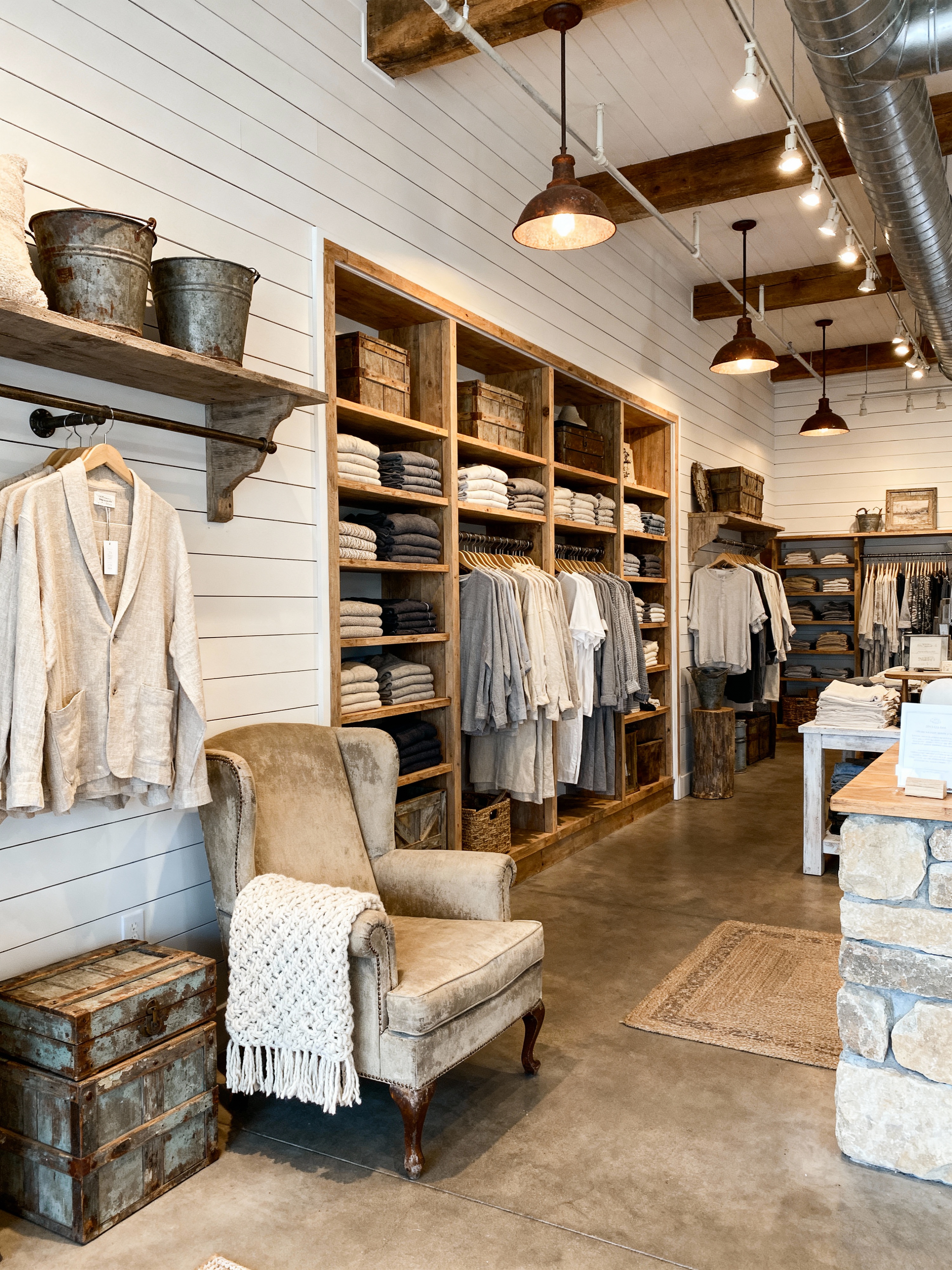 clothing store with farmhouse style . with rustic charm and shiplap walls and open shelving and cozy feel and neutral tones and vintage decor and industrial accents and natural textures